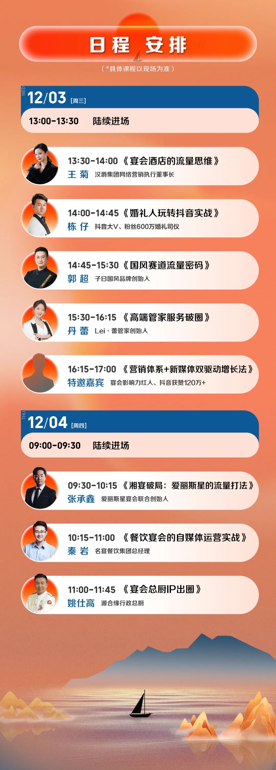 从宴会酒店流量战略到抖音实战,从国风赛道到高端服务;聚焦多门店协同、餐饮宴会运营、总厨IP打造……跳出思维误区,一场专为行业量身定制的流量盛宴,即将启幕!
