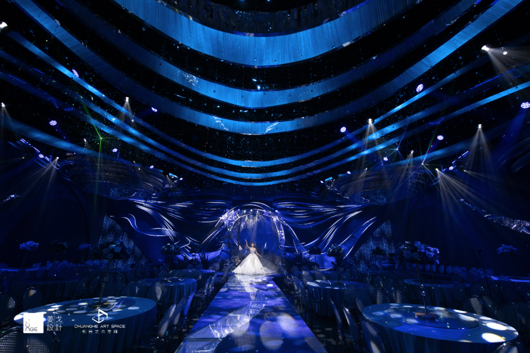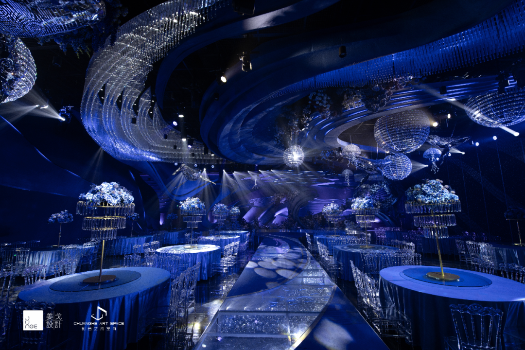 舞台是整个设计的视觉中心。玻璃楼梯盘旋而下,将整个空间联动起来,是整个设计的点睛之笔。当新人拾级而上,脚下数控星星灯明灭闪烁,垂挂的水晶链折射万千光辉,此刻,新人将携手在时间与光河中前行。