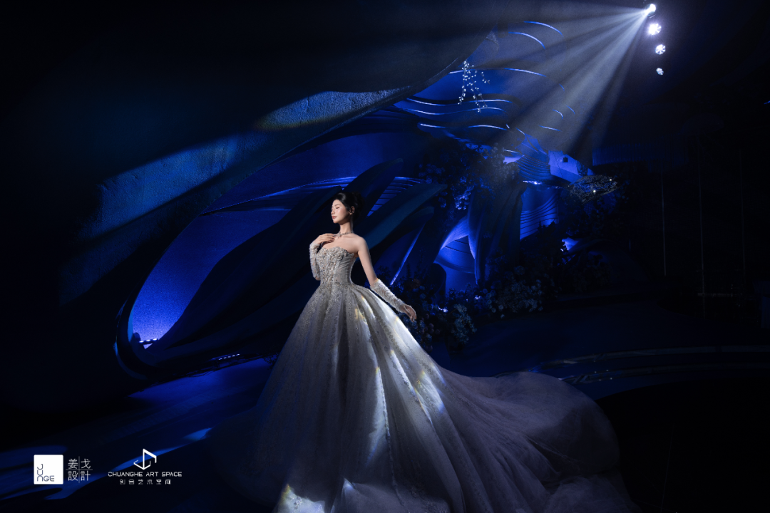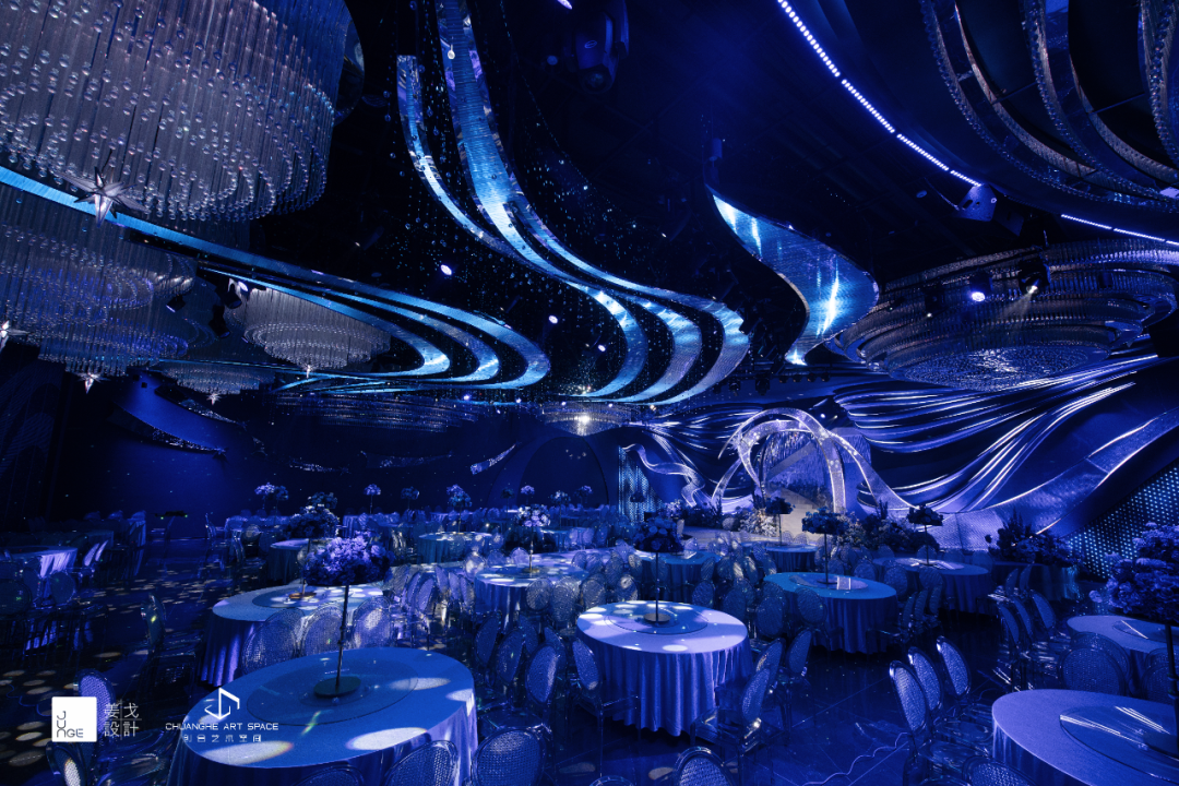 以“星海双生”为核心理念,打造了【寰宇星阶】星空厅与【潮汐回响】海洋厅。姜戈通过材质、光影与动线的精密编织,让空间本身成为情感的载体,从而达到“海天共鸣”的风格联动,演绎一场从浩瀚星辰到蔚蓝深海的沉浸式变换,象征着爱情既如星空般永恒,亦如海洋般深邃的双重特质。