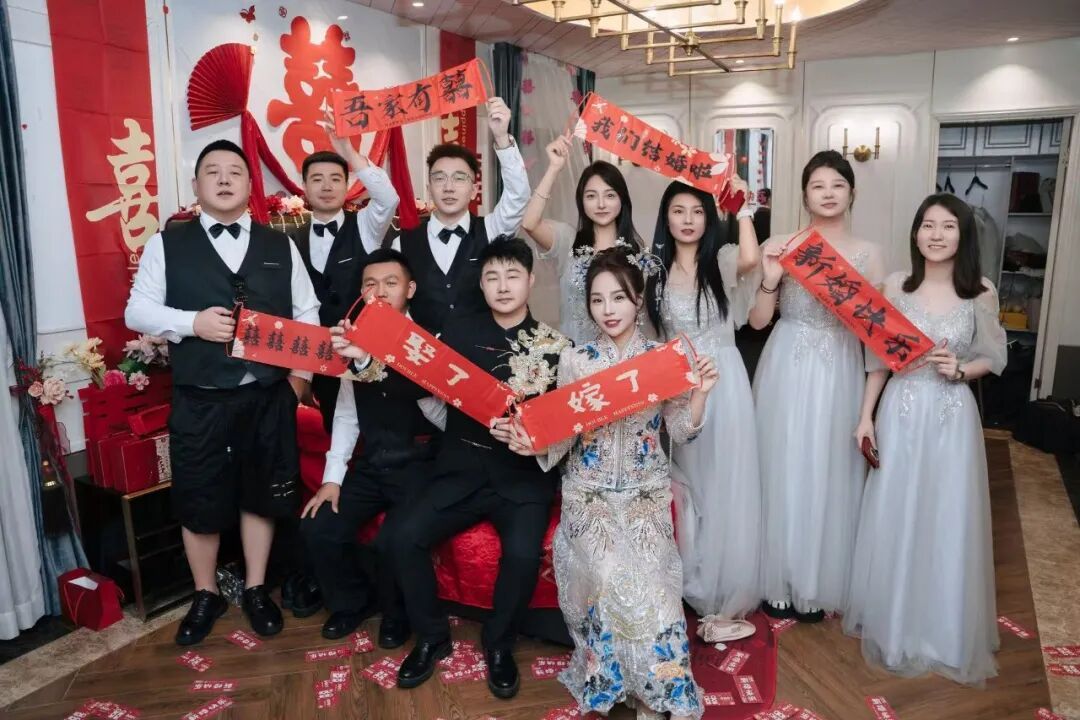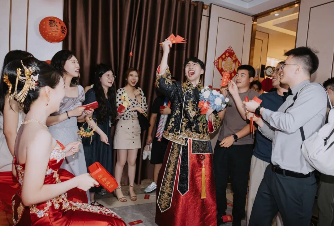 姐妹团用有趣的堵门游戏考验新郎,此时新郎和兄弟团要同时发小红包,用诚意打开新娘家的大门,堵门游戏时间要恰到好处,10分钟左右就刚刚好。