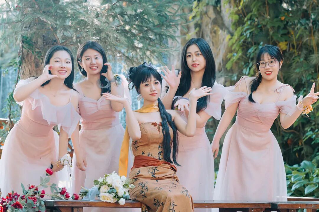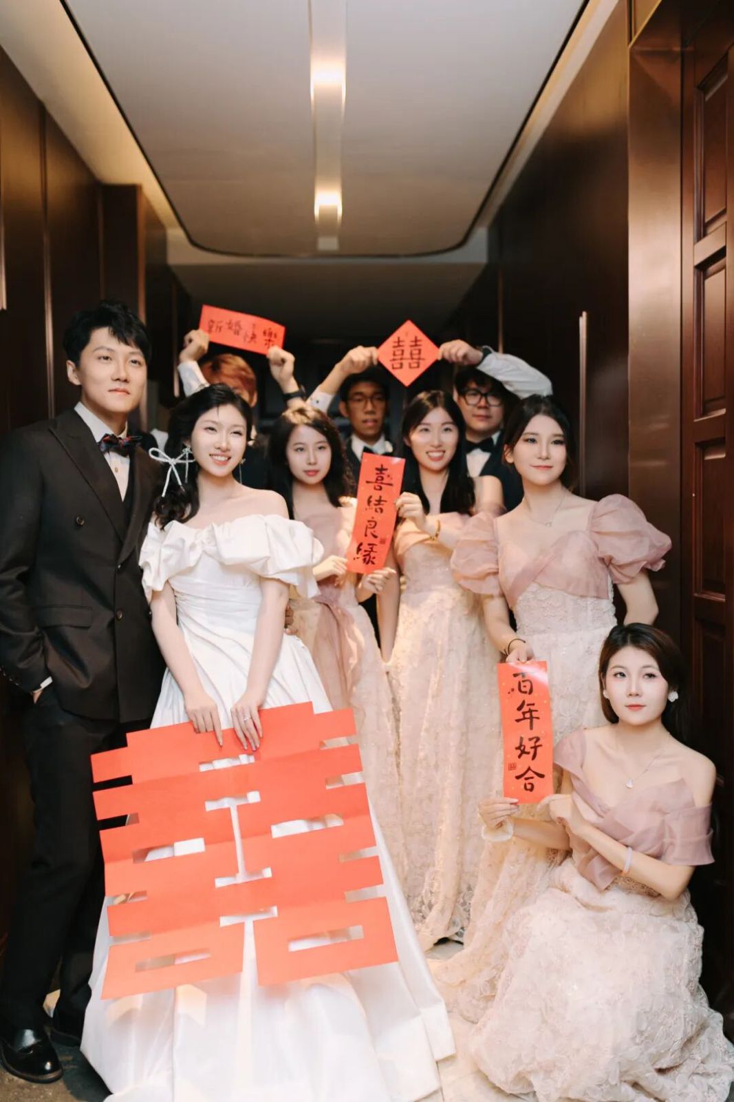 新娘精心整理好妆容换上美美的接亲服装,然后利用这片刻的闲暇时光和家人、朋友们一起合影留念,记录下这温馨美好的瞬间。