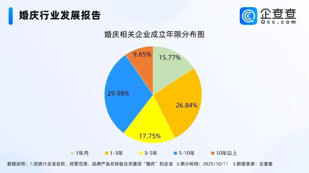 企查查显示,国内现存婚庆相关企业141.68万家。从经营时间来看,成立年限在5-10年的相关企业最多,占比29.98%。其次,成立年限在1-3年、3-5年的相关企业分别占比26.84%、17.75%。注册量方面,2024年全年注册25.16万家相关企业,截至目前,今年已注册17.8万家。