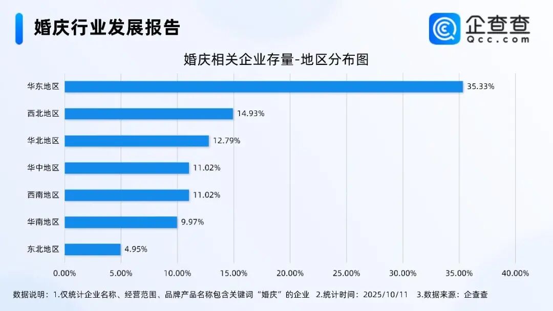 企查查显示,从地区分布来看,婚庆相关企业主要分布在华东地区,占比达35.33%。其次,分布在西北地区、华北地区的相关企业分别占比14.93%、12.79%。