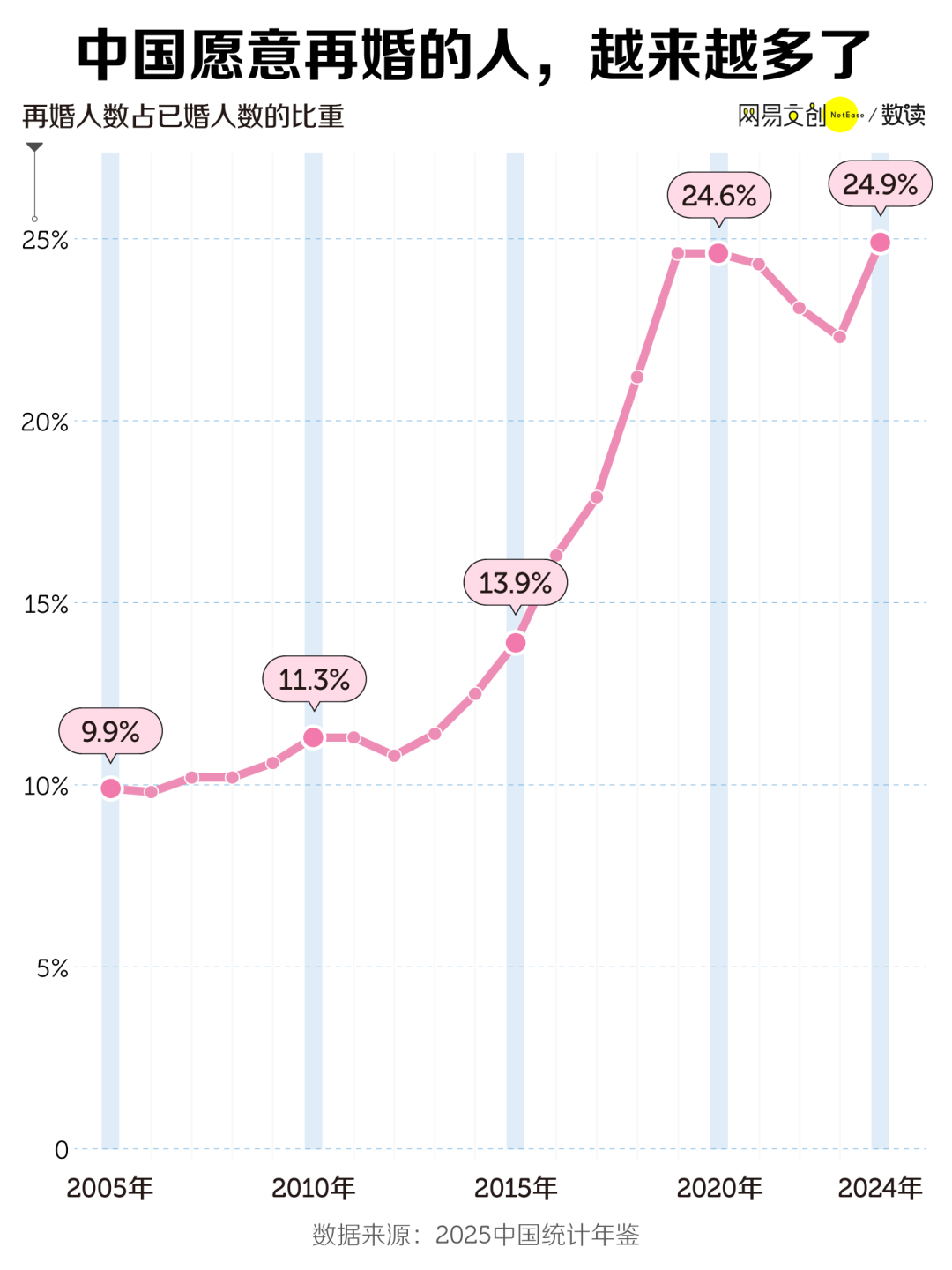 根据历年《中国统计年鉴》,过去 20 年,中国再婚人数占已婚人数的比重不断上升,2005 年还不足 10%,到 2024 年已经达到 24.9%。换言之,现在每四个登记结婚的新人里,就有一个人不是第一次领结婚证了。