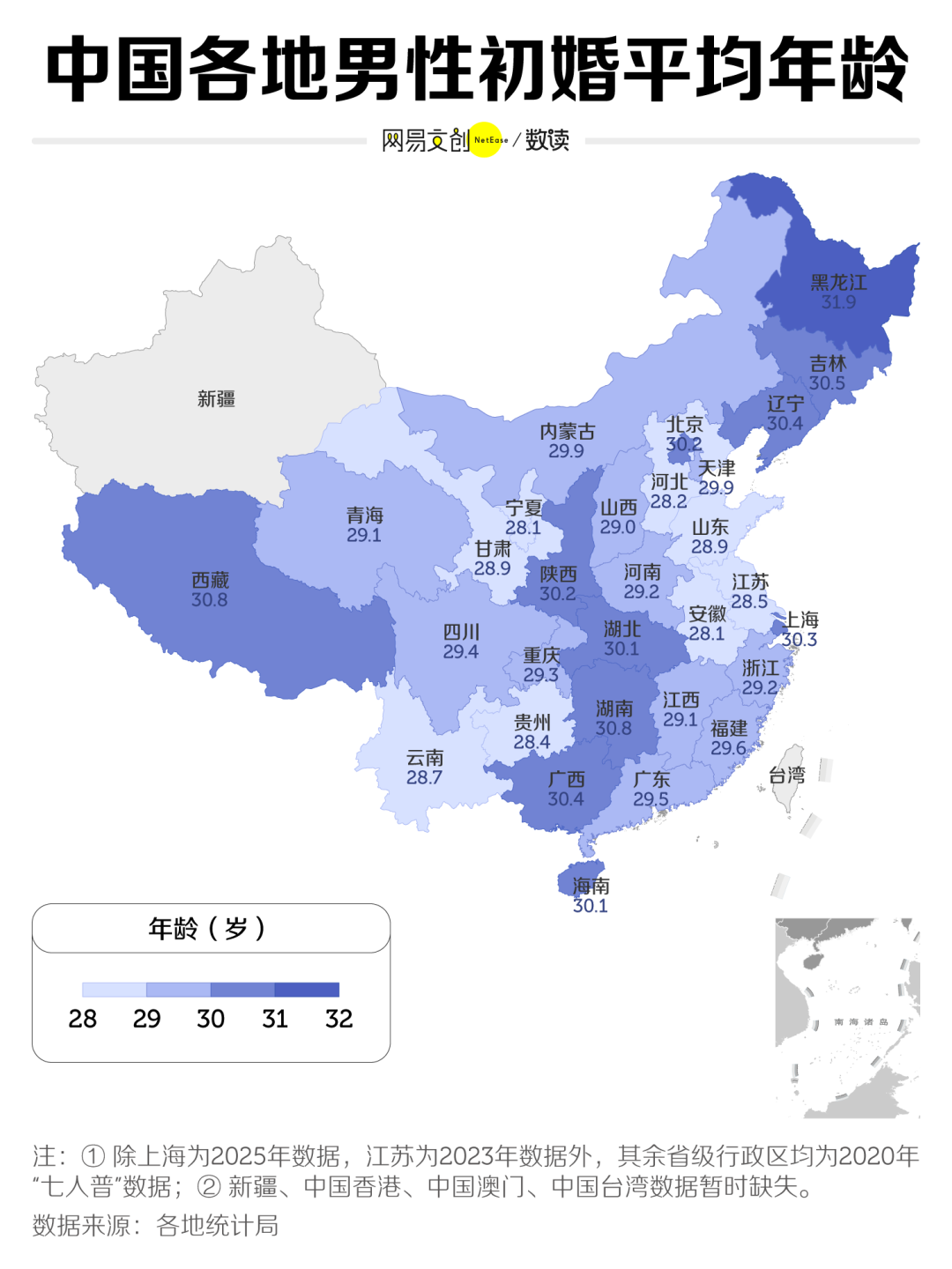 从地域来看,东北的年轻人在推迟结婚这件事上,最先达成高度默契。尤其是黑龙江的男女平均初婚年龄双双位居全国第一,分别在 31.9 岁和 31.1 岁。