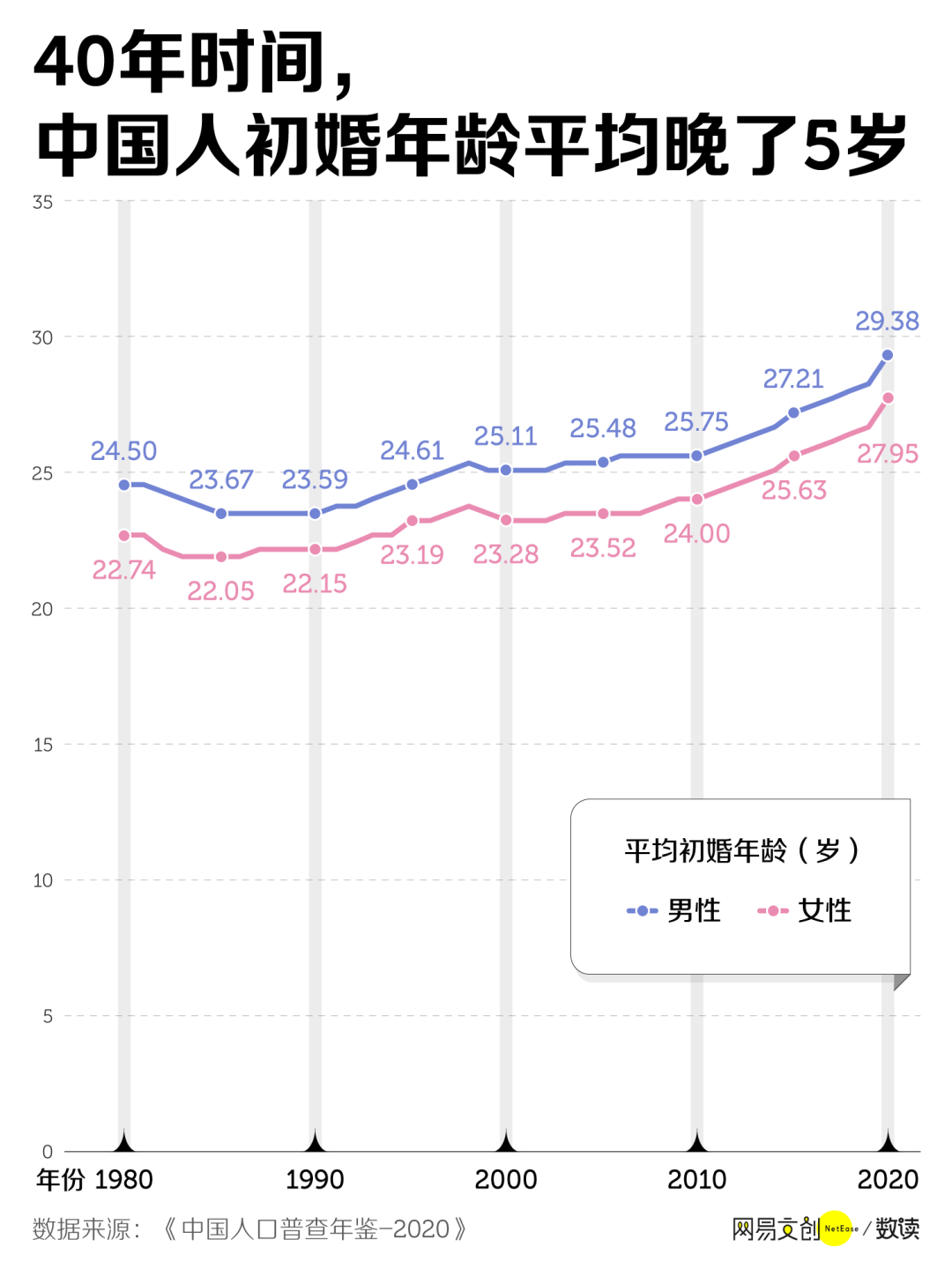 1980 年时,男性的平均初婚年龄还是 24.5 岁,女性则是 22.74 岁。而到了2020年,这个数字已经分别跨过了 29 岁和 27 岁的门槛。