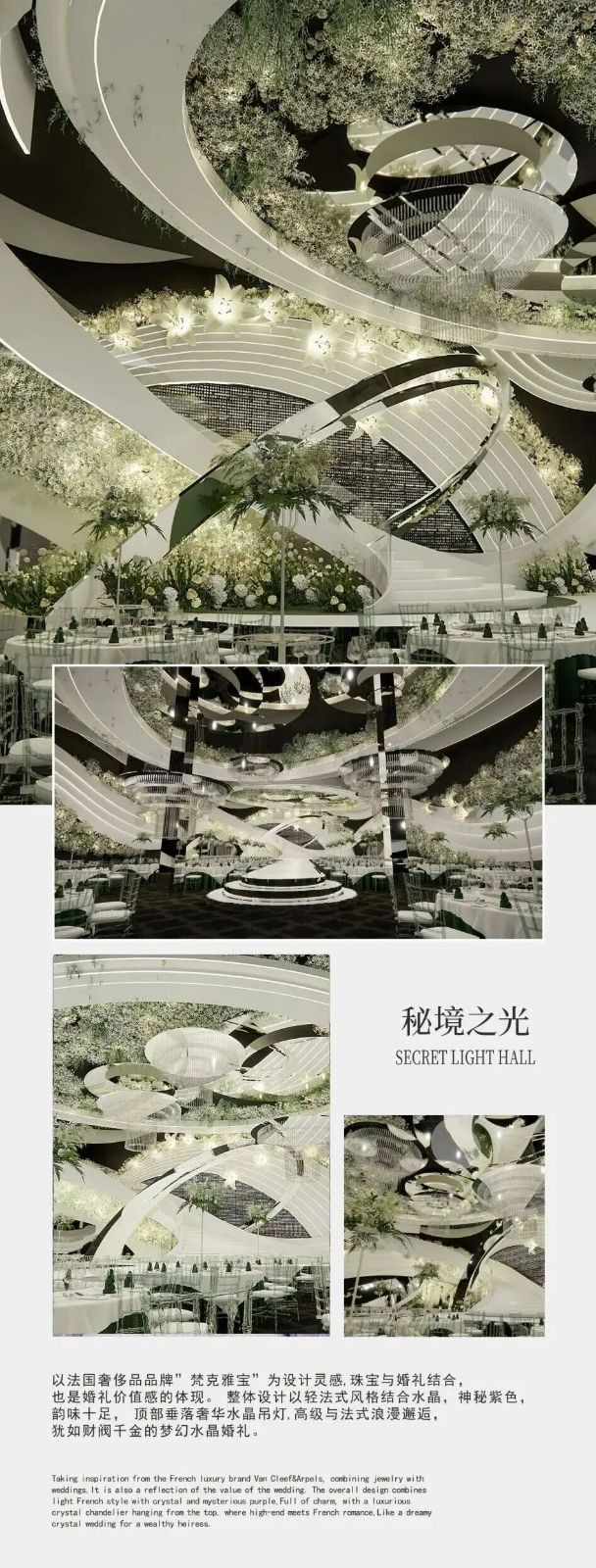 清新自然的浪漫空间,见证您与爱人的幸福时刻在秘境之光每一场婚礼都是一次优雅而温馨的邂逅这里,纯白的基调与清新的绿色交织搭配曲线造型与大量花艺装饰营造出宁静而灵动的氛围为您和您的爱人呈现一场纯粹而浪漫的婚礼体验。