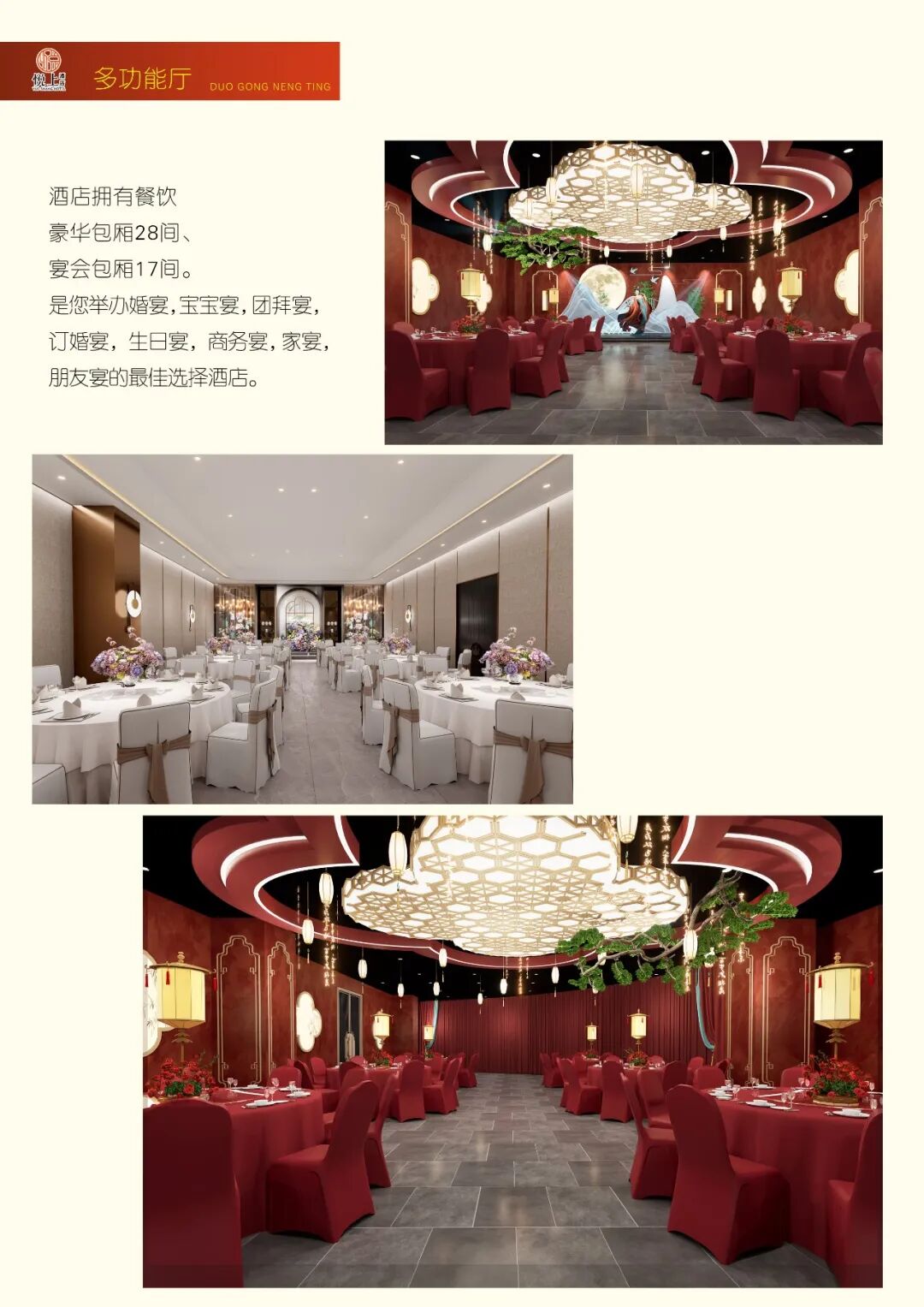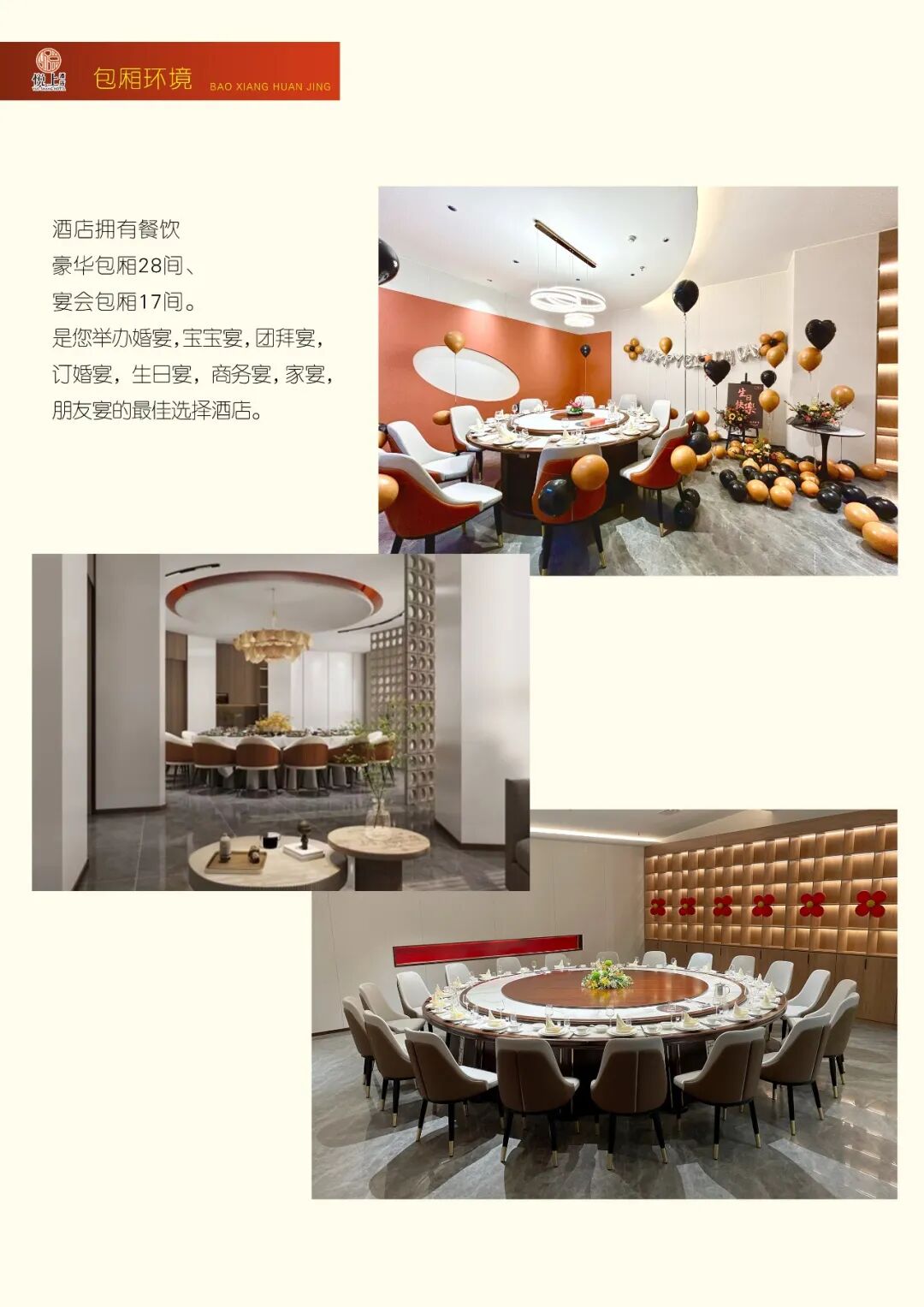 酒店拥有餐饮豪华包厢28间、宴会包厢27间,大型高端主题宴会厅9个,多功能会议室2个,可同时容纳约2000人用餐。