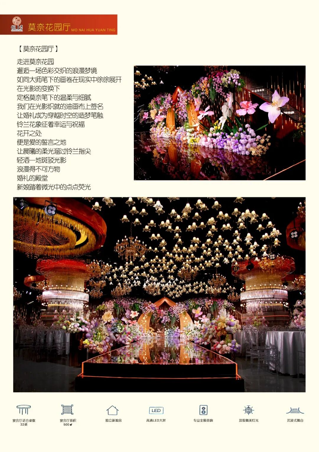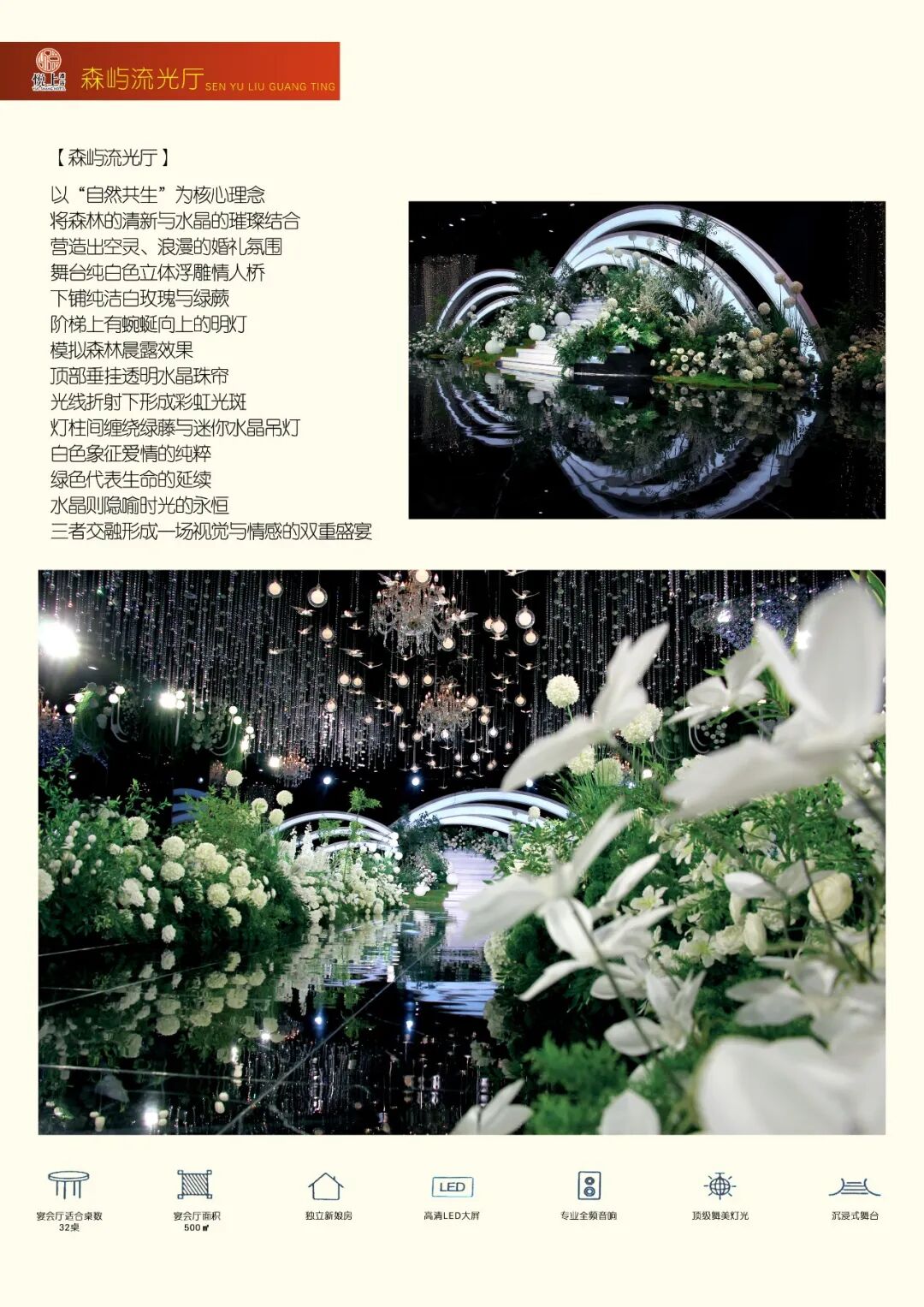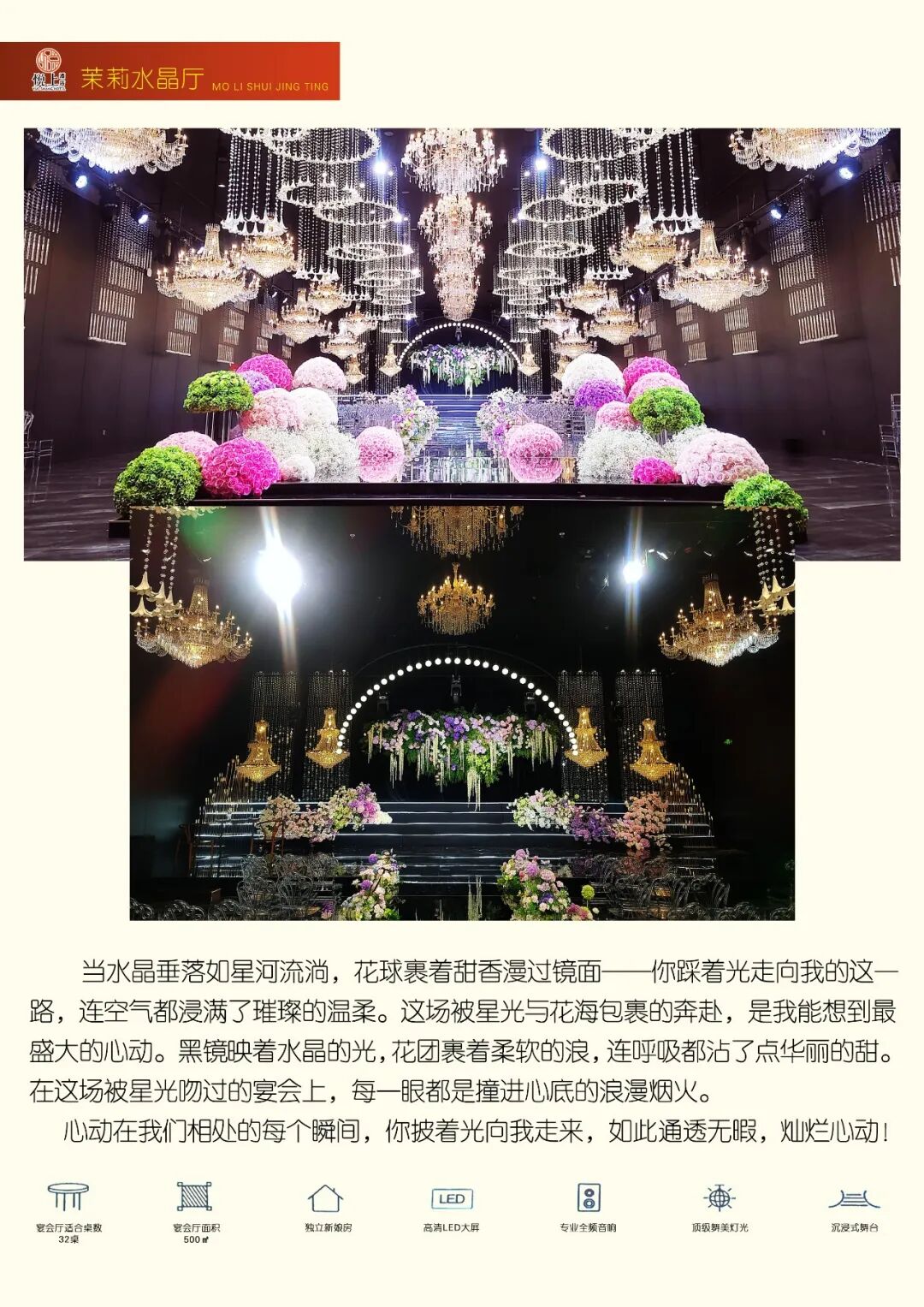 我们坚持以影院级标准打造舞美灯光效果,让每一场活动都熠熠生辉。配套自营的高端婚纱礼服馆,以及经验丰富的五大金刚服务团队,从着装到执行,提供一站式闭环服务。