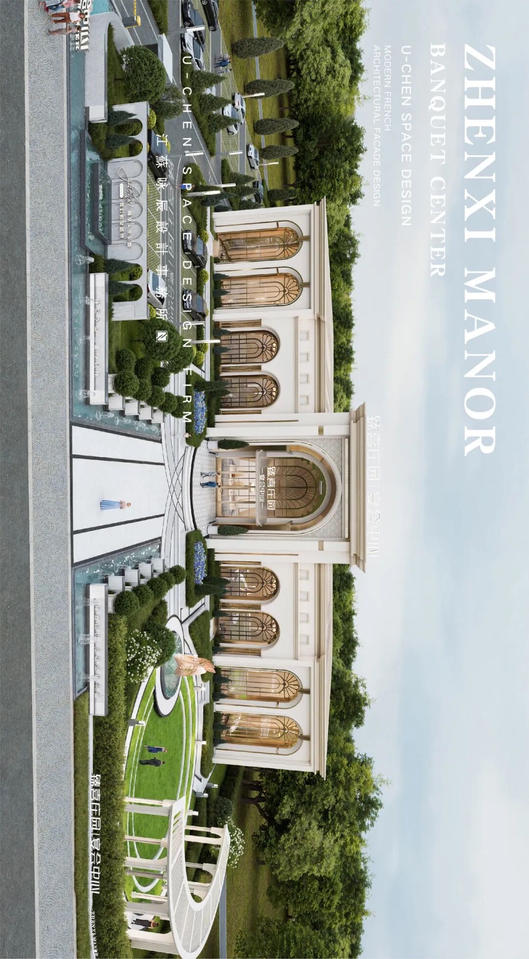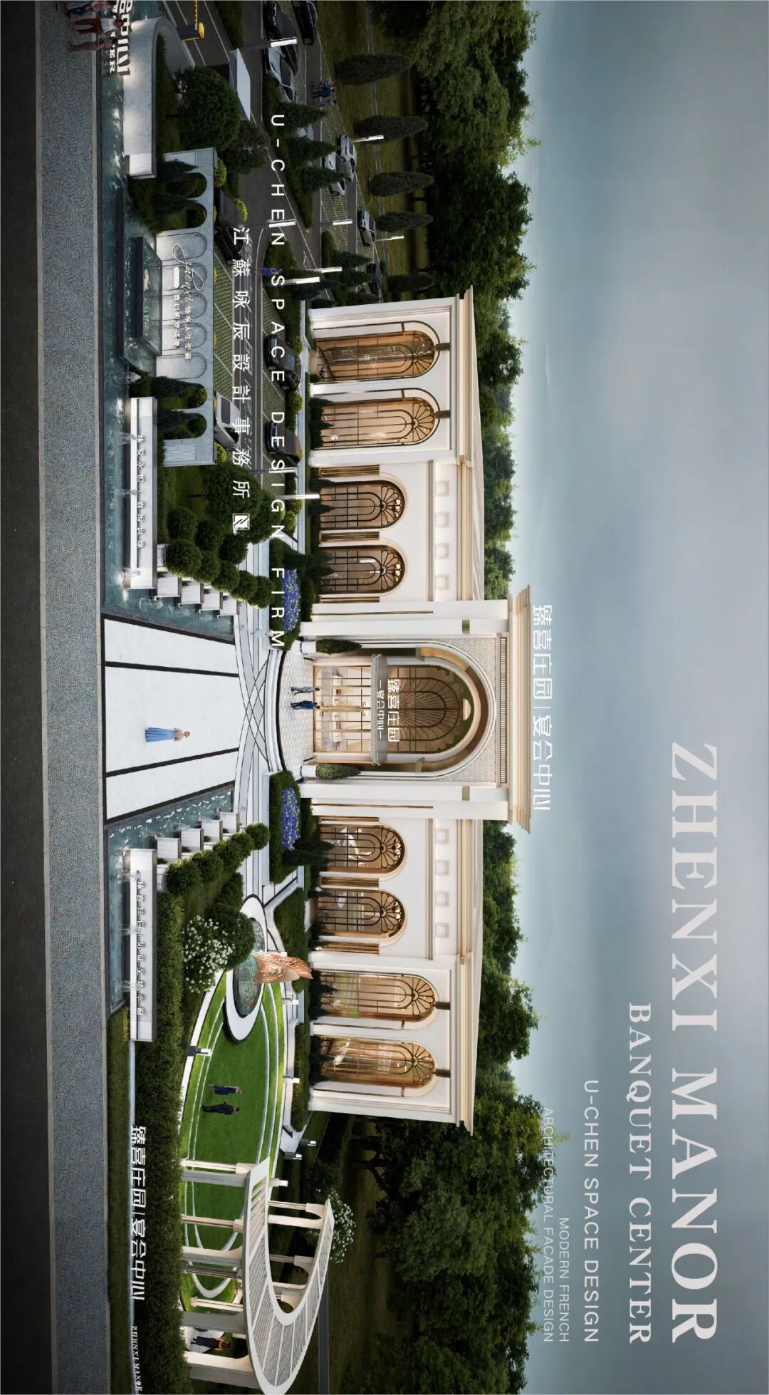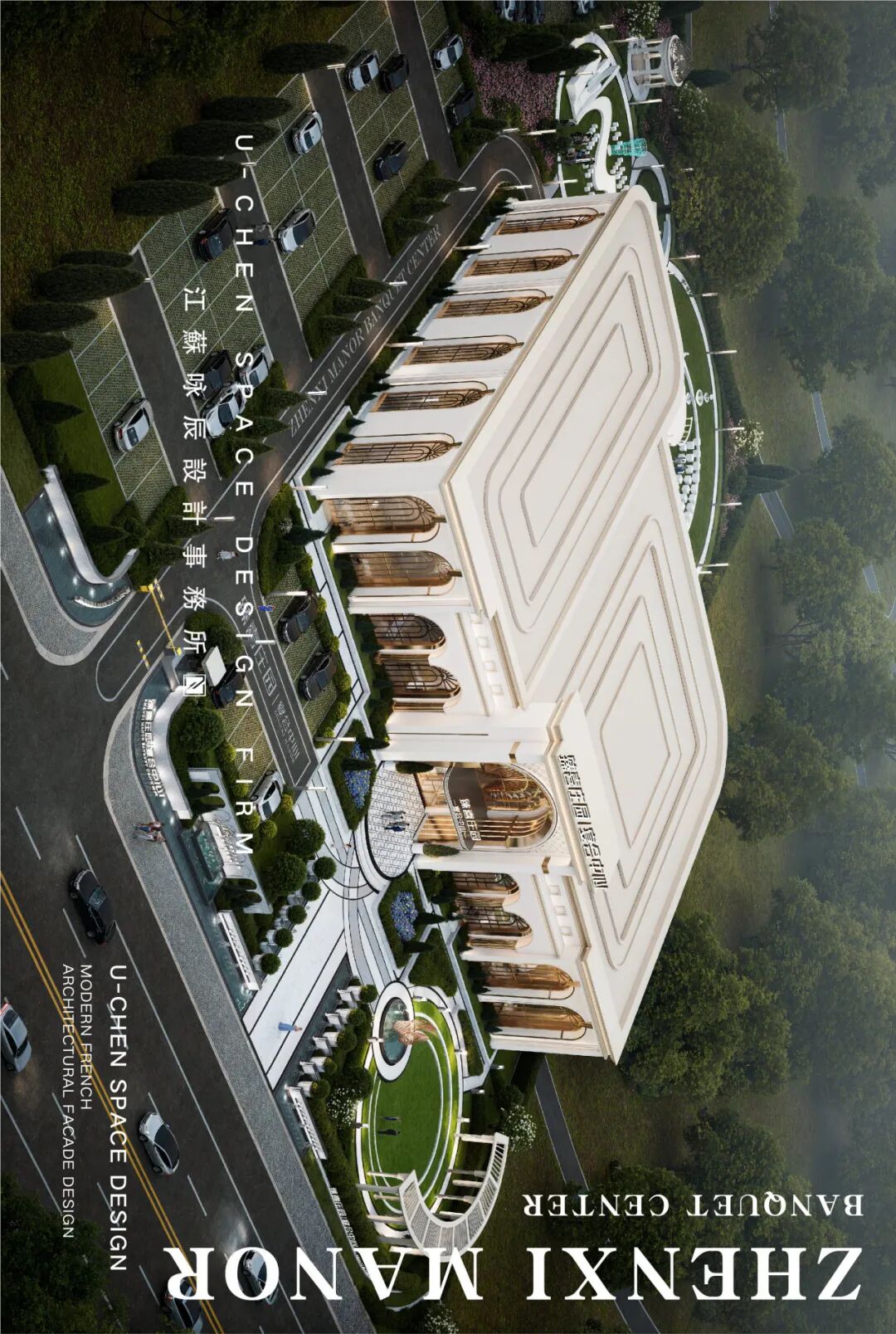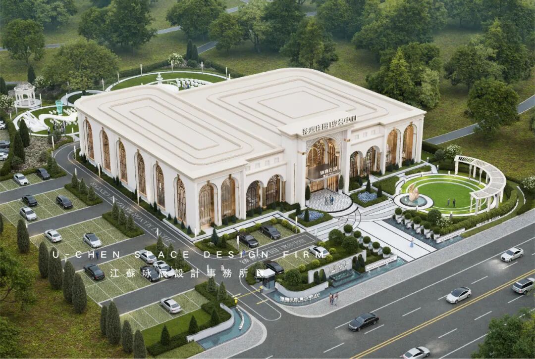 Jiangsu Yongchen Design Firm has successfully created an elegant, romantic, warm, and modern wedding hall with a modern and minimalist French style, incorporating British details. The off white building body, iconic petal arch porch, and classic French hat roof together form an unforgettable visual image.