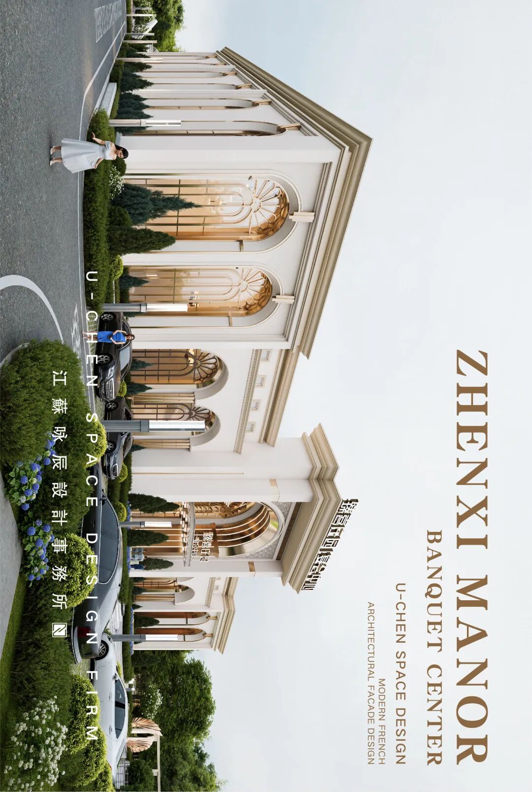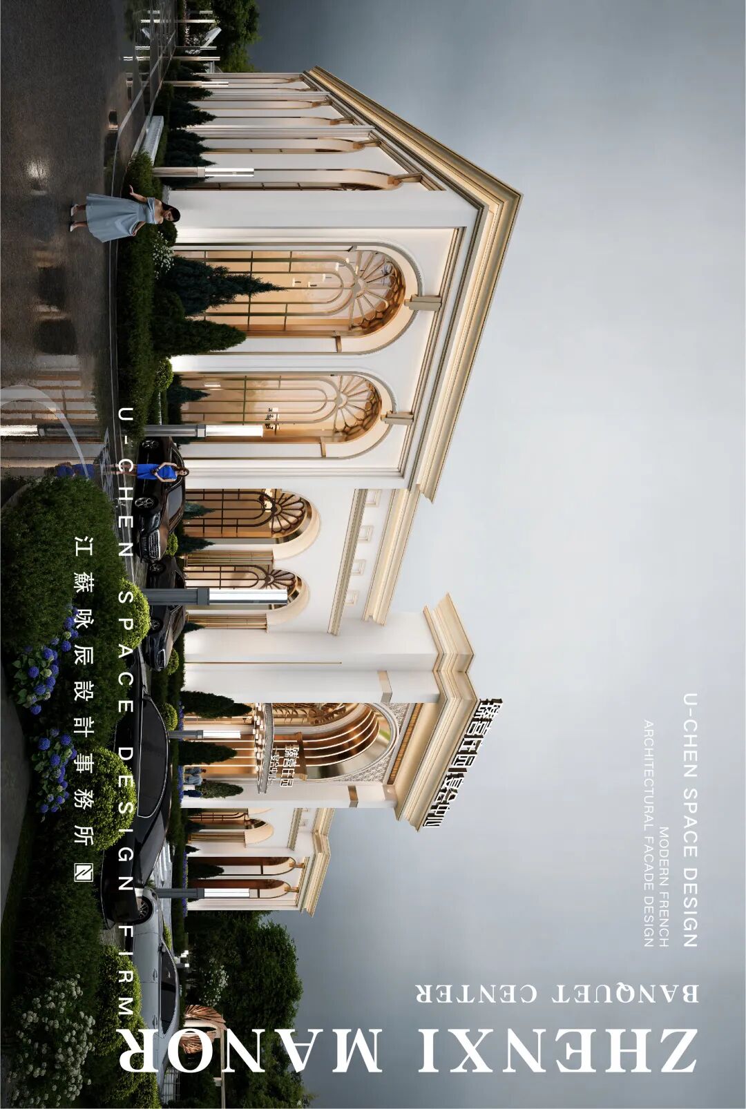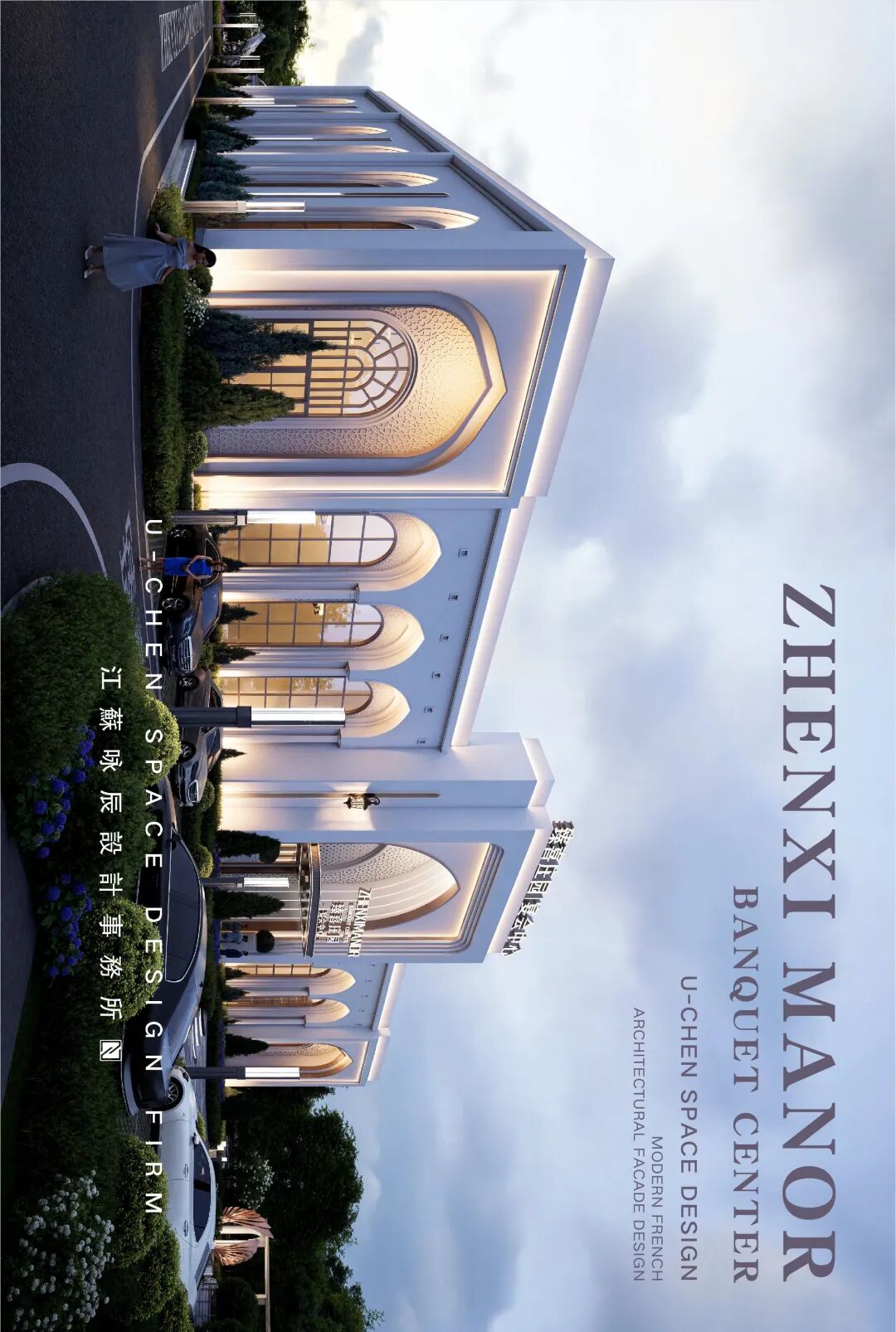 江蘇咏辰設計事務所以现代简约法式风格,融合英伦细节,塑造一个典雅、浪漫、温馨且现代的婚礼殿堂。米白色的建筑主体、标志性的花瓣拱形门廊和经典的法式帽头屋顶,共同构成了令人过目不忘的视觉形象。