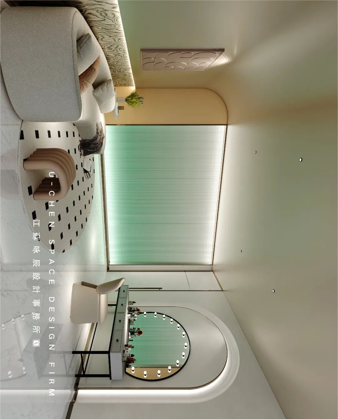 打造兼具现代精致感点缀东方韵味的精品小型宴会厅空间,江蘇咏辰設計事務所通过材质对比、线条提炼、灯光点缀、软装配饰,在有限的空间内实现"小而精"的轻奢体验,满足高端小型多功能宴会厅需求。化妆间的设计加入了浅绿色,象征新生、宁静与希望,完美契合婚礼当天的情绪。让化妆间成为一个远离喧嚣、让身心放松并焕发光彩的“秘境”。