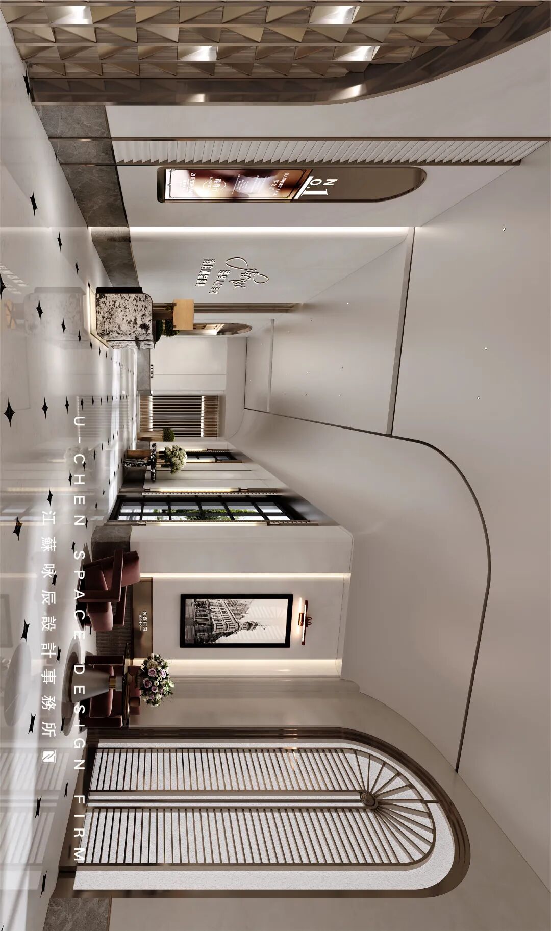 江蘇咏辰設計事務所对于整个大堂的设计将围绕“星光”与“仪式感”展开。八边形星芒吊灯是空间的视觉焦点和灵魂,象征着爱情的绽放与永恒。拱形门洞带来庄重与温柔,放射状线条则如同光芒四射,引导动线并延伸空间感。米白色奠定纯净优雅的基调,金色点缀则升华出轻奢的质感,共同打造一个令人过目不忘、仿佛步入婚礼殿堂的艺术空间。