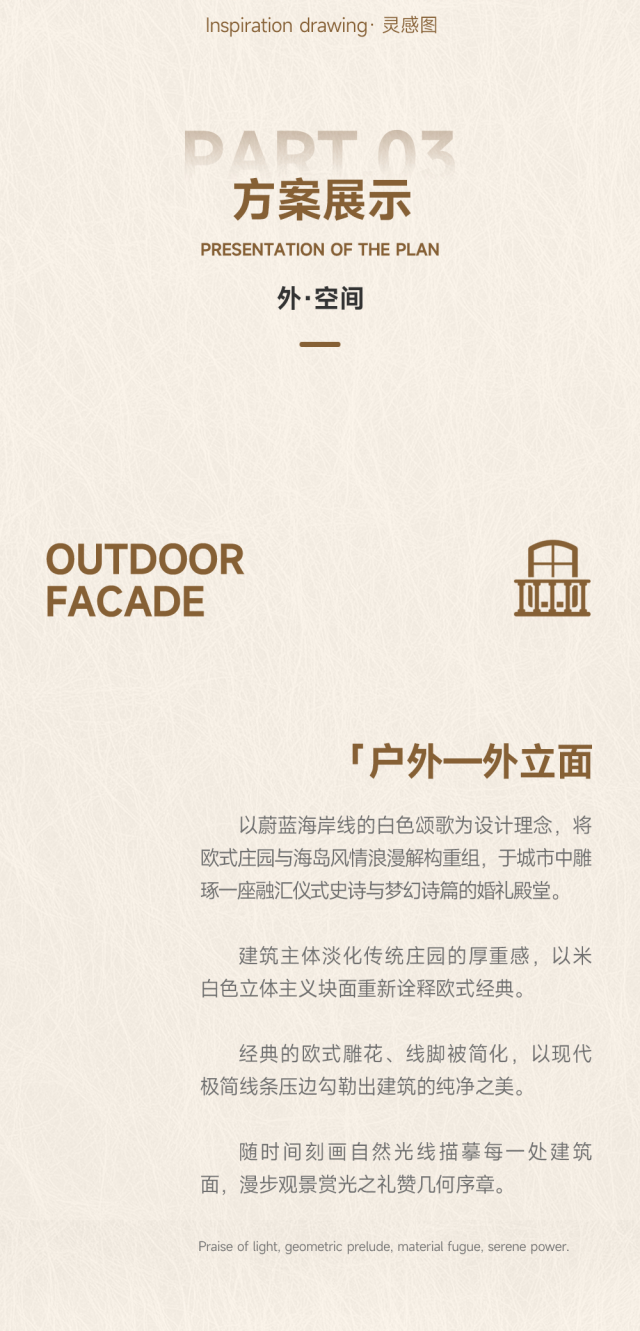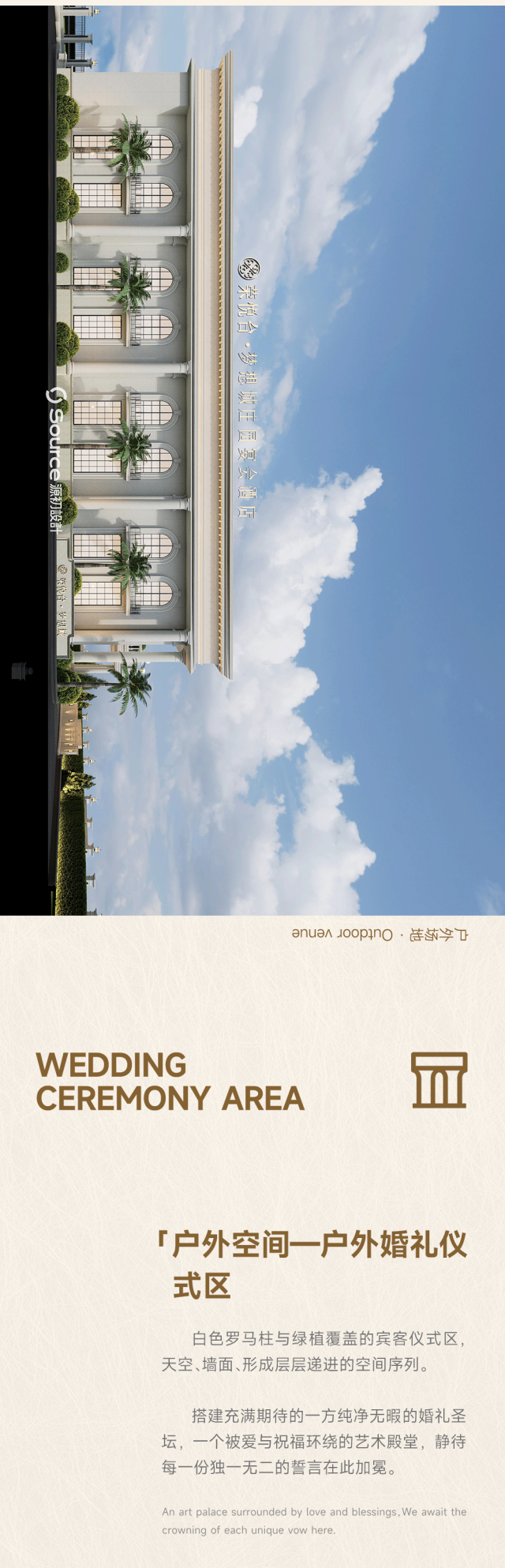 以蔚蓝海岸线的白色颂歌为设计理念,将欧式庄园与海岛风情浪漫解构重组,于城市中雕琢一座融汇仪式史诗与梦幻诗篇的婚礼殿堂。