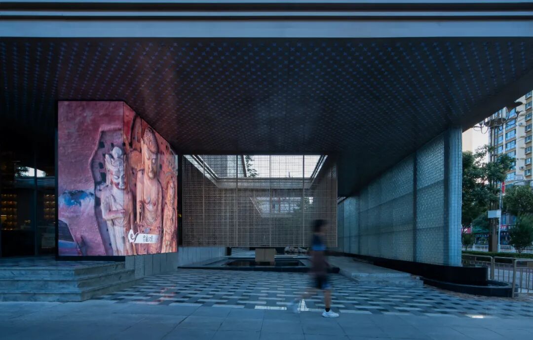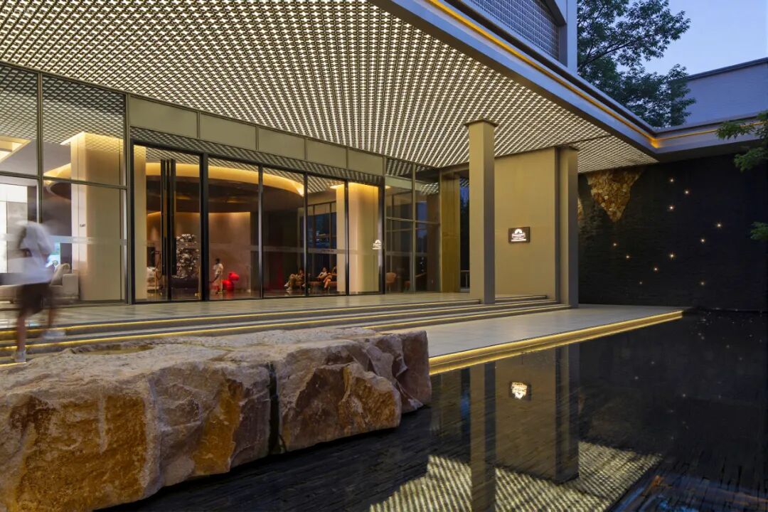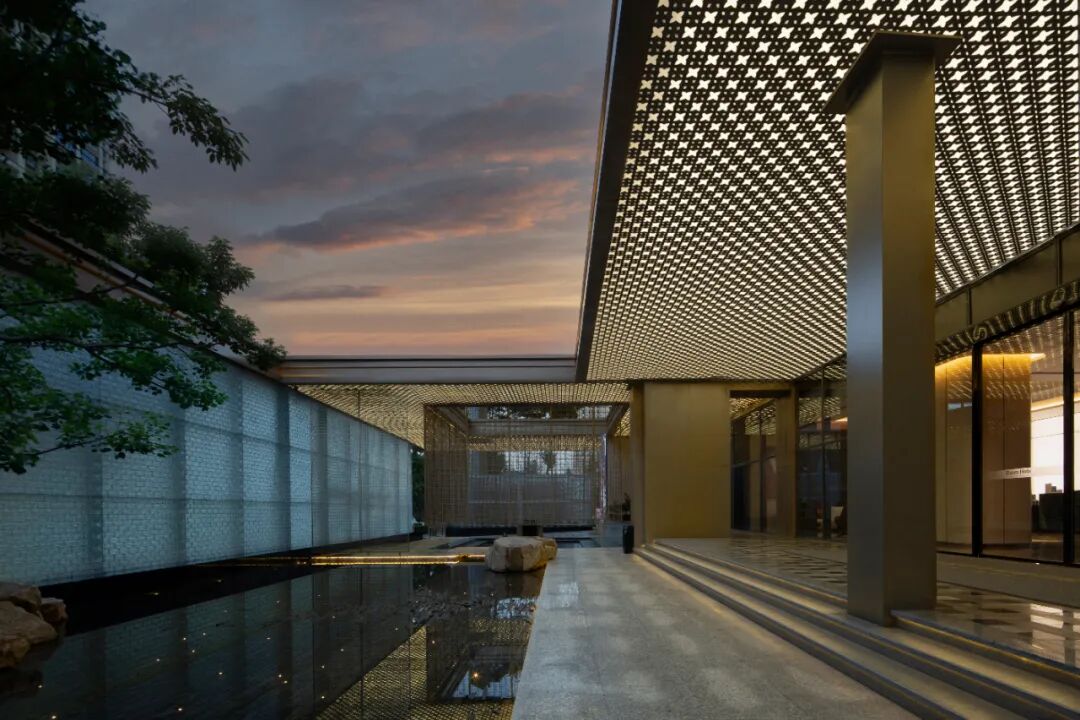 傍晚,暮色中光影的边界渐渐模糊,酒店明亮的灯光照亮着旅客的归途,玻璃砖逐渐晶莹剔透起来,而门前的一池浅水下缀着点点星光,正与城市的晚霞相得益彰。层层叠叠的幕帘时隔时透,檐下镂空的纹样镌刻出细腻的光幕,用光与影的粒子化语言,将酒店前场这一本易被忽视的过渡区域,转换为了华丽璀璨的场所记忆点。