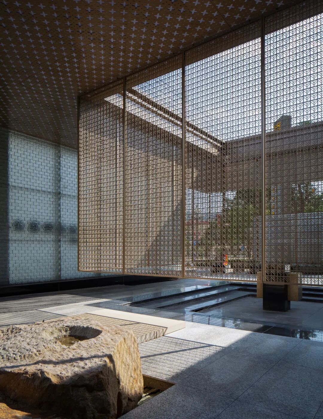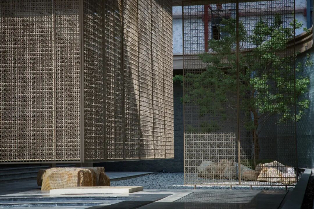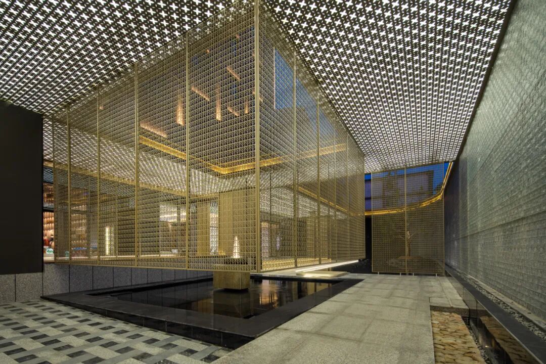 香槟金色的金属格栅从上方垂下,由古典窗花演绎而成的纹样宛如一层轻柔的帘幕包裹着中央的水景与石台,简单的几何块面延伸出空间的庄重感。而透过这隔而不断的帘幕,朦胧中可见远处的天光和影影绰绰的树木,空间的纵深在这一刻被放大到极致,丰盈的层次感给予了空间无限的意境。