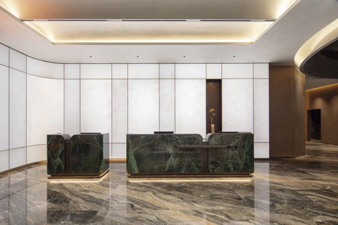 酒店前台位于大堂一隅,由墨绿色奢石打造,天然的瑰丽纹理搭配圆润的金属包边,透光石的背景墙由金色的金属嵌条分割点缀,形成视觉上的韵律感,使优雅知性和东方韵味相映成趣。