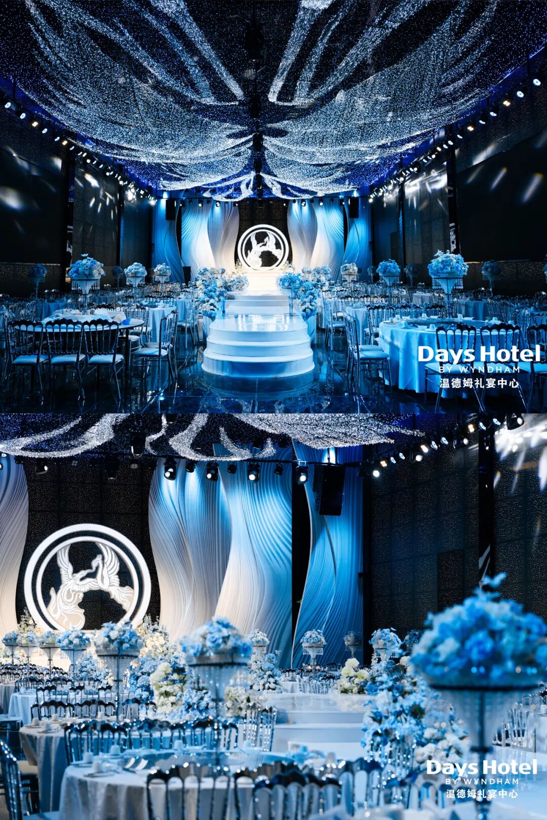 千万颗水晶吊顶搭配香槟色花球海洋,LED开合屏新娘出场,营造法式奢华婚礼。