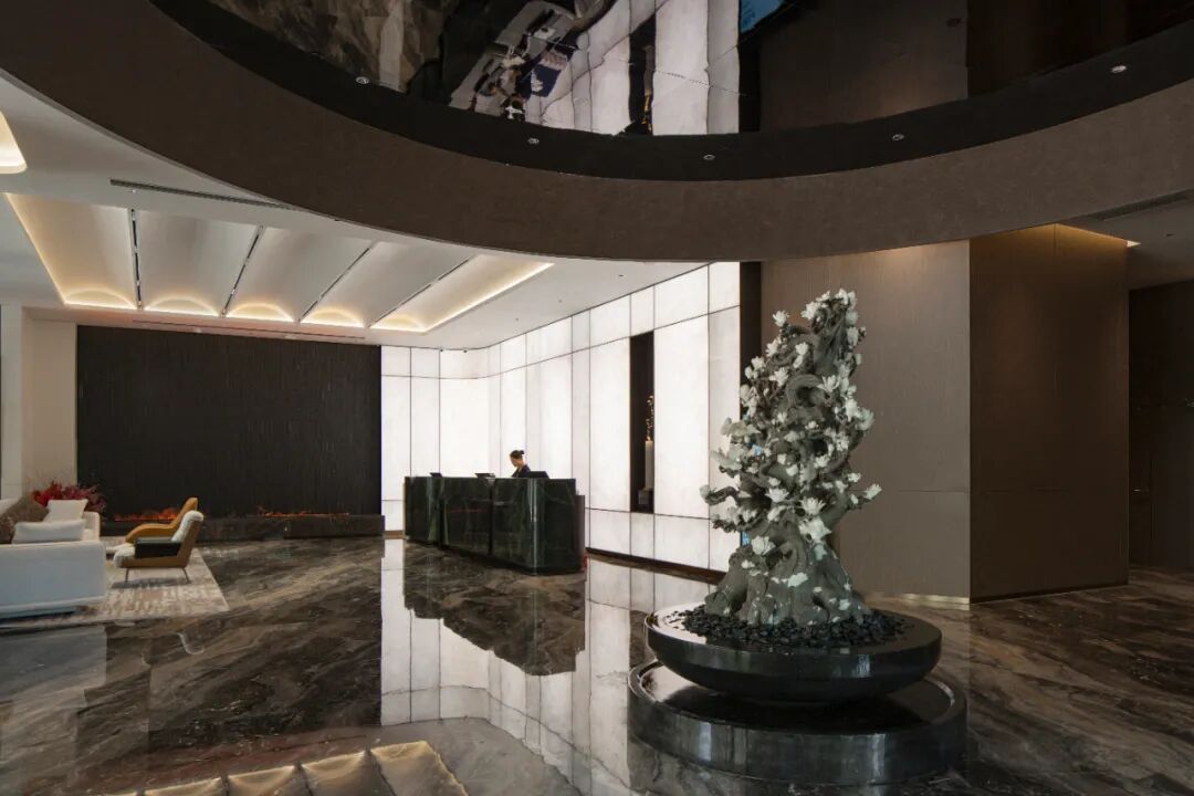 大厅里的结构柱同样采用弧形倒角的包边,灵动的弧形线条消除直线条的坚硬感,也柔化了空间氛围。大理石地面独特的纹理和光泽,呈现出精美的质感,深色木纹墙面的选用,给予空间温和而素雅的印象。