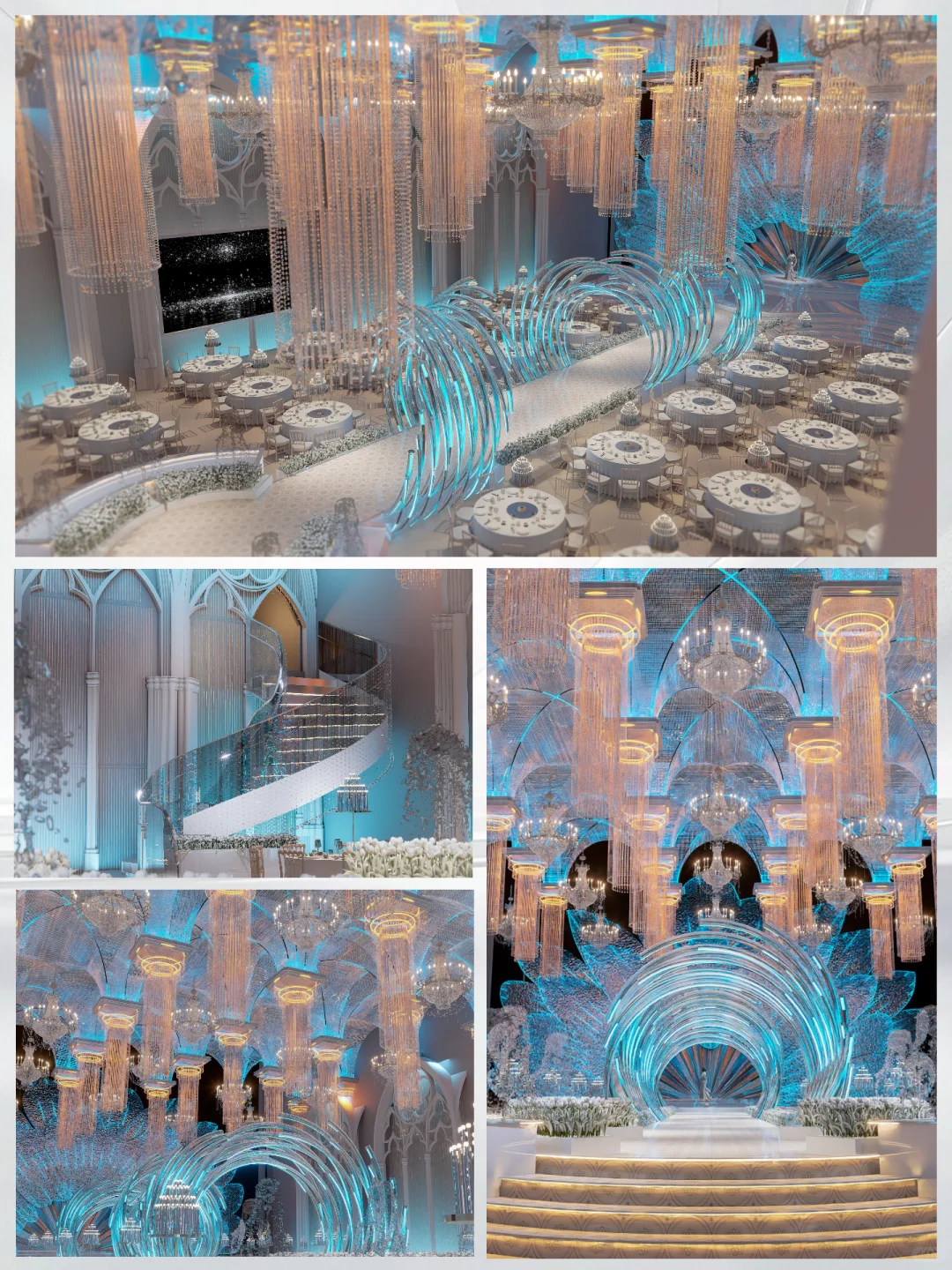 高耸的哥特式拱门与柱子在柔和的蓝光中熠熠生辉