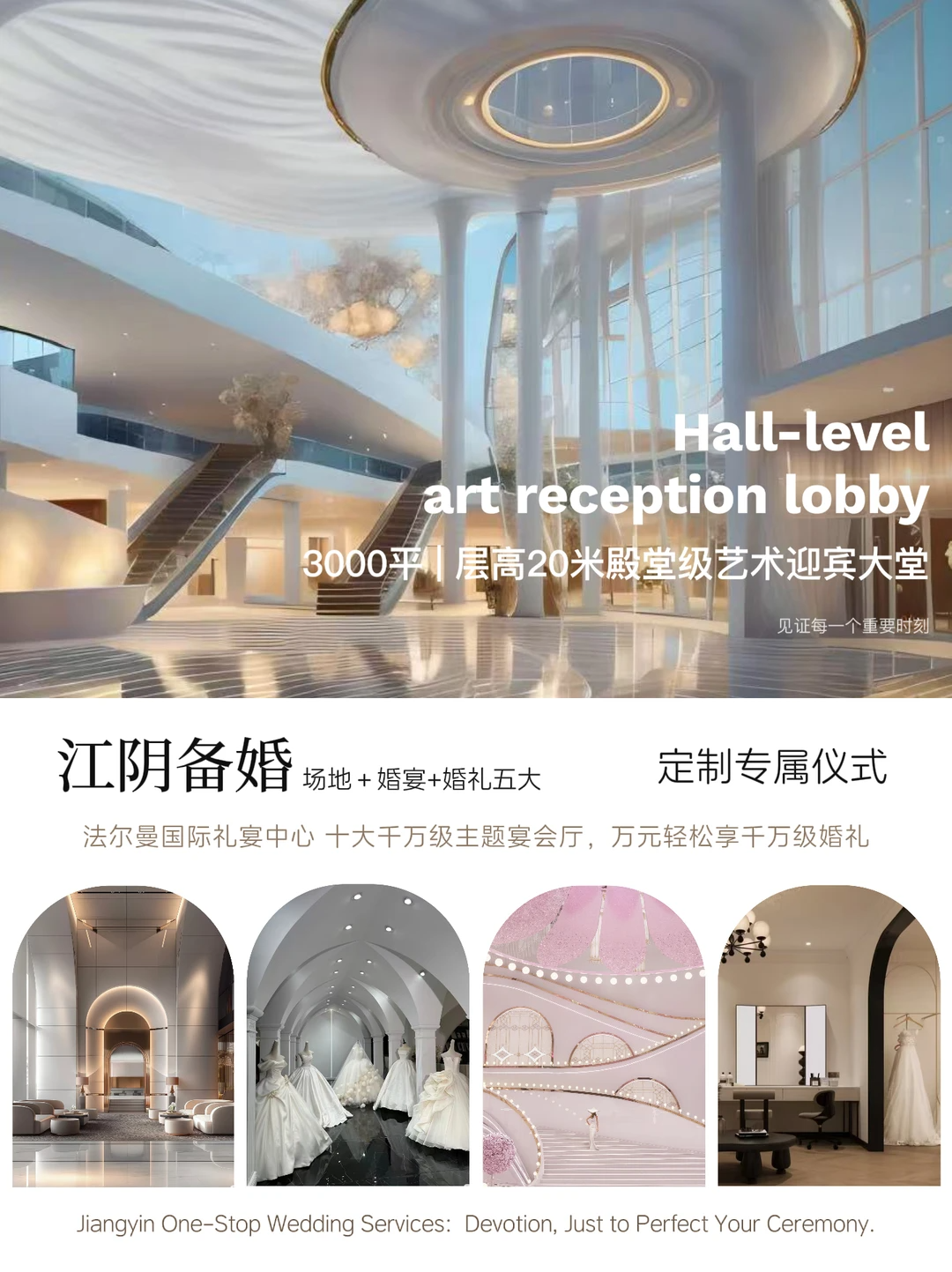 法尔曼国际礼宴中心,占地50000平,设有10大宴会厅和3大户外花园草坪,打造江阴一站式独栋婚礼堂。