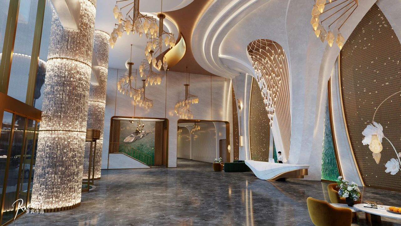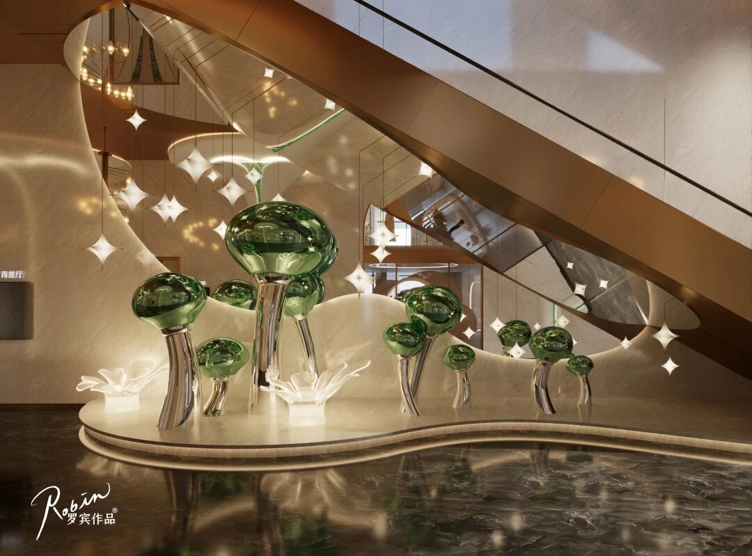 区块链点光源+金色不锈钢雕刻,构筑大堂的科技氛围感,兼顾美感与功能性。