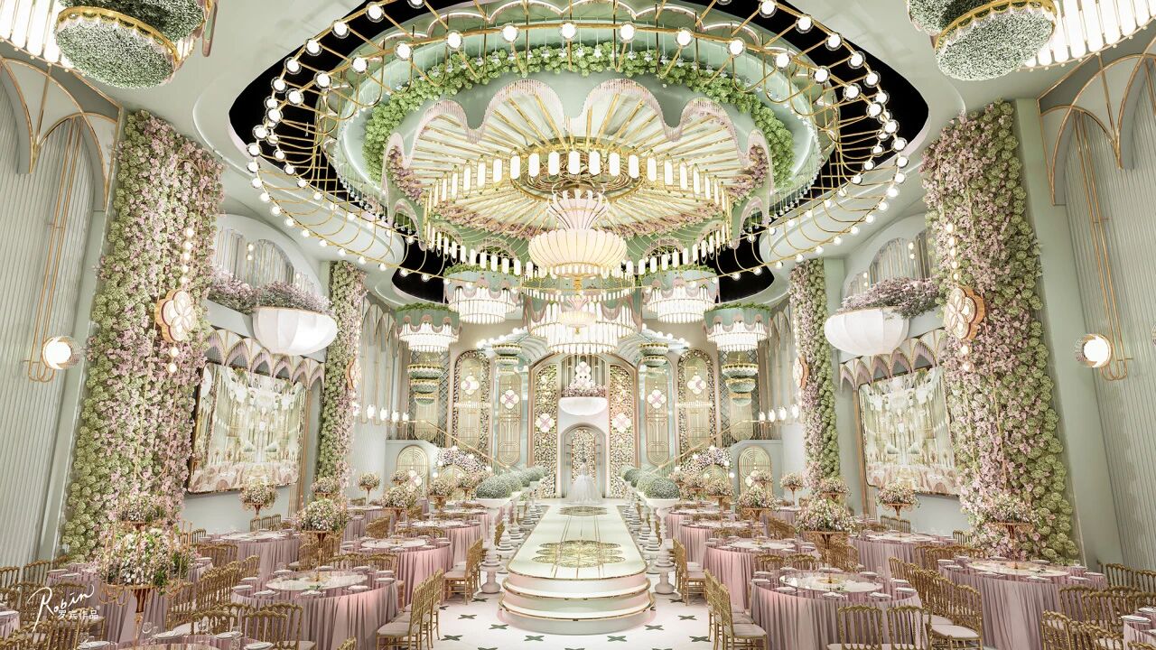 铂雅厅以复兴的法式风格为基调,大面积运用粉与草绿,缀以金属与奶白,构筑出丰富的视觉层次。
