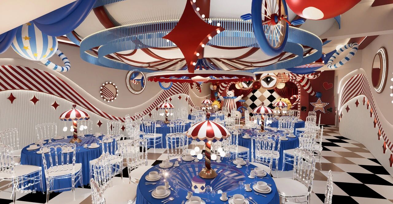 宝宝厅以经典的小丑元素为灵感,结合百老汇氛围感,色彩对比强烈,识别度高,能够迅速吸引孩子们的注意,彷佛置身于的乐园中。
