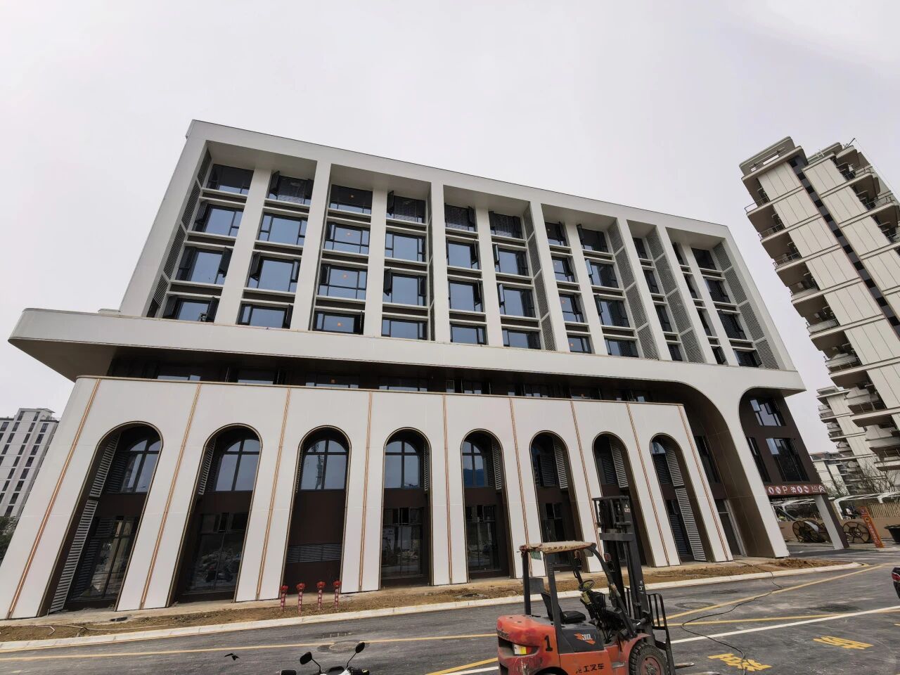 2023年战略升级,拿地自建集团总部,集大小宴会、餐饮包厢、酒店客房与办公功能于一体,我们配合甲方思路,以总部大楼外立面气势,创意融入宴会拱门元素,以水养木,打造鹰潭新地标。