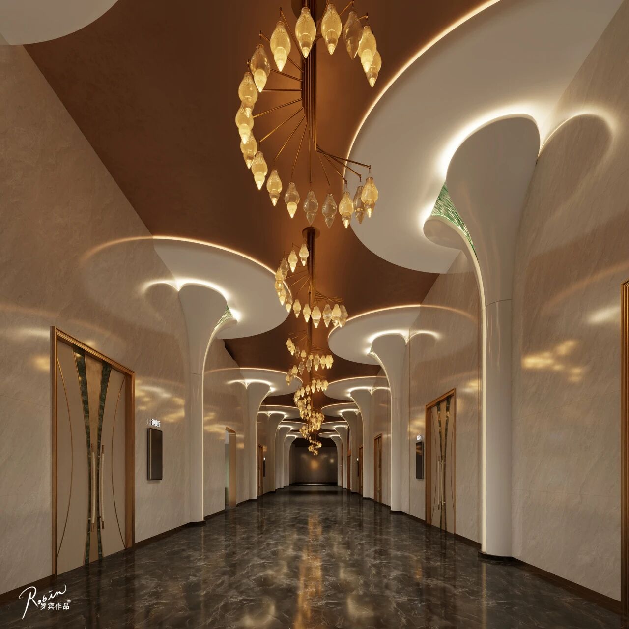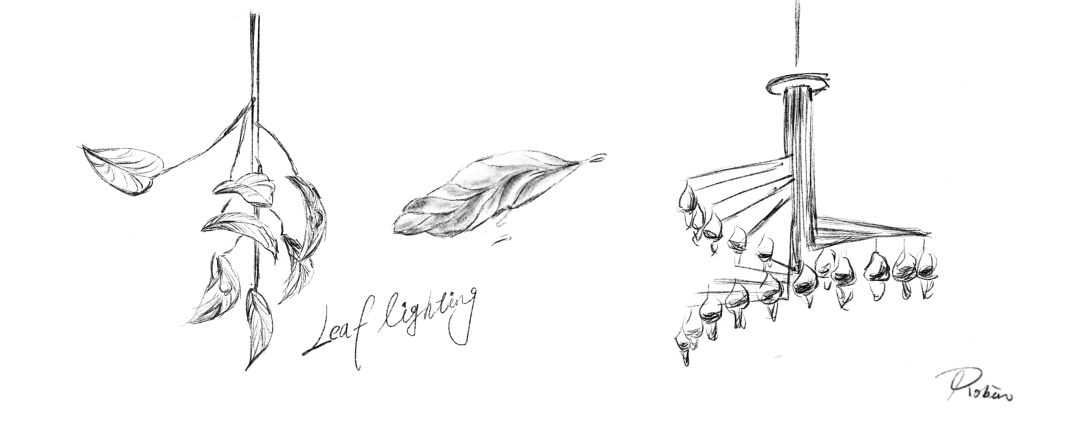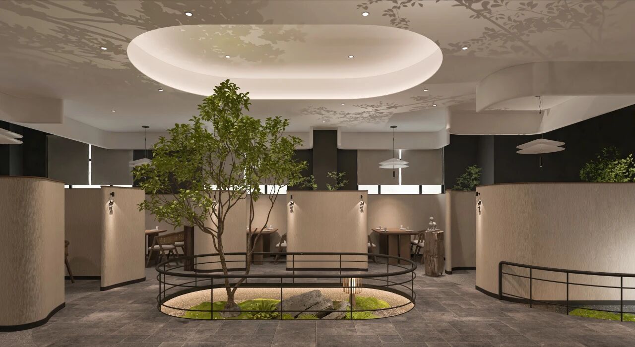 一楼主通道延续大堂的设计意象,树阵列铺开,营造出强烈的秩序感与引导性。吊顶之上,果实灯具如繁星点缀,让宾客从踏入大堂至电梯,始终被充满叙事感与艺术格调的氛围包裹。