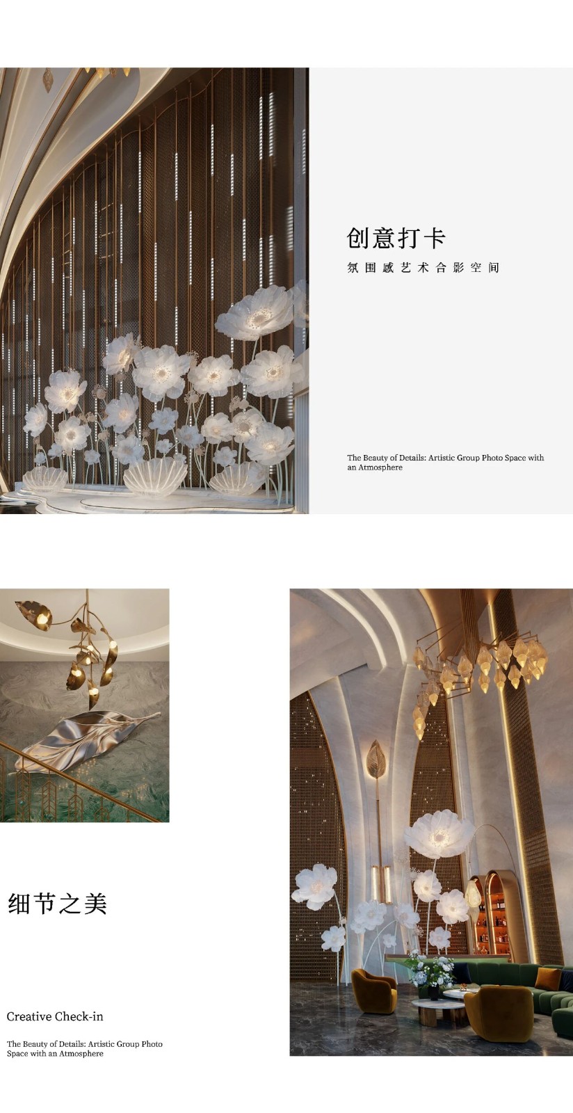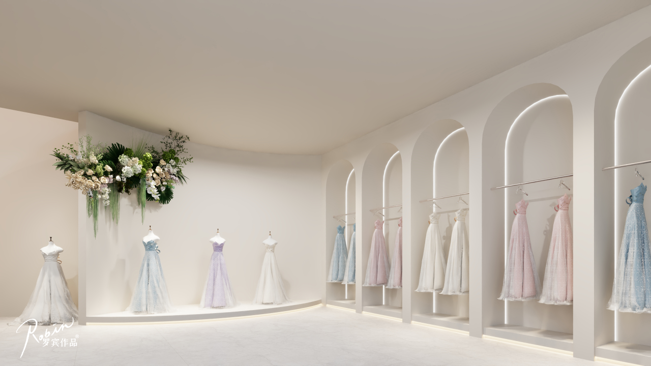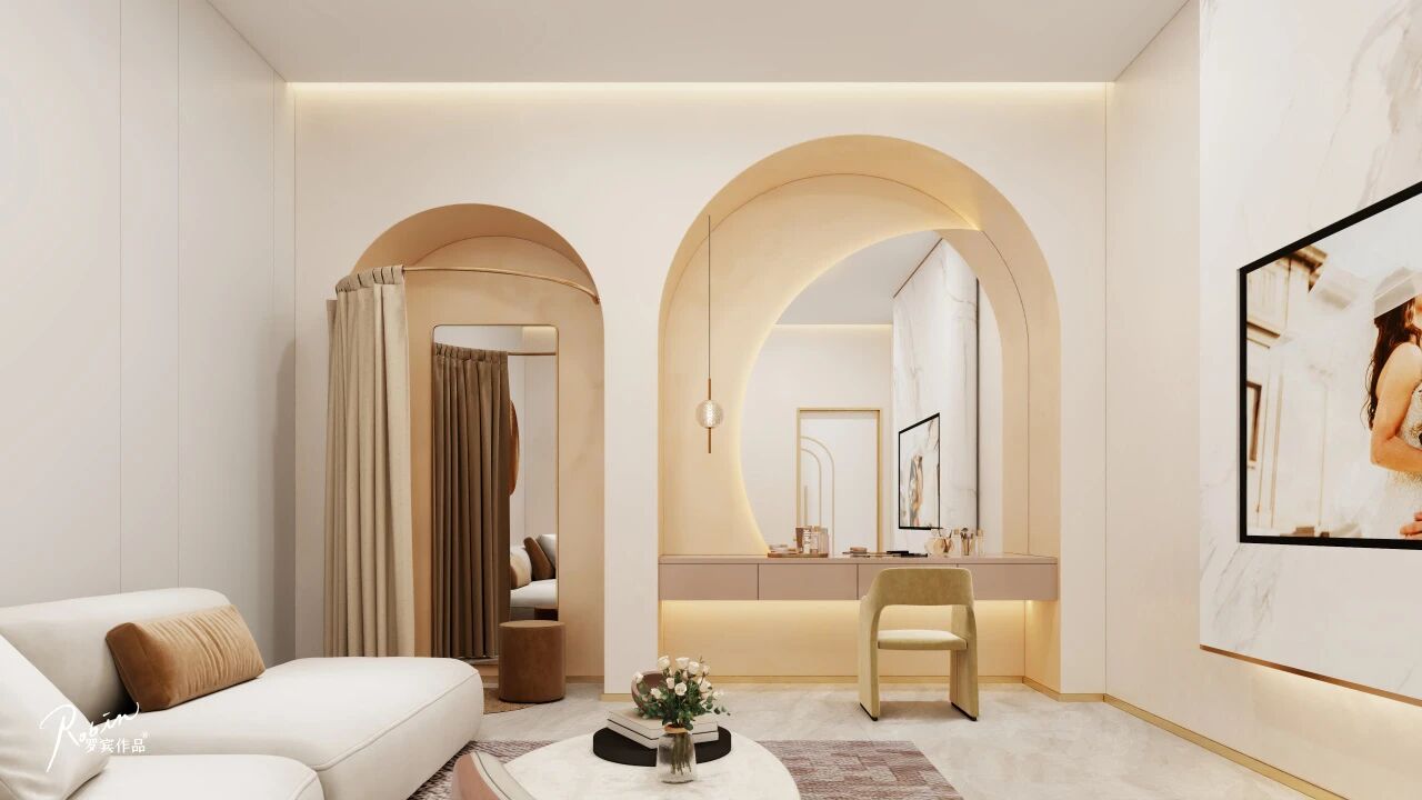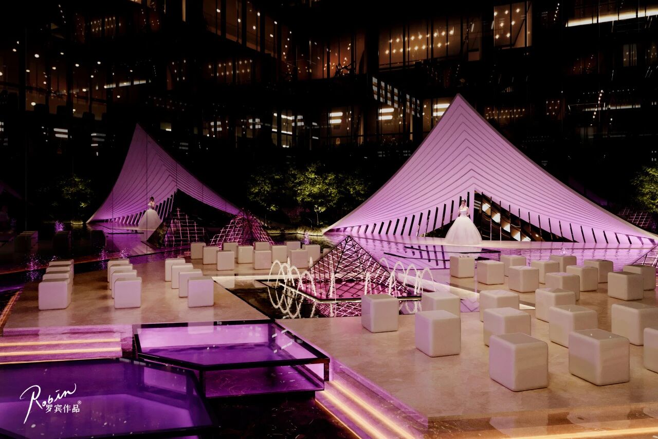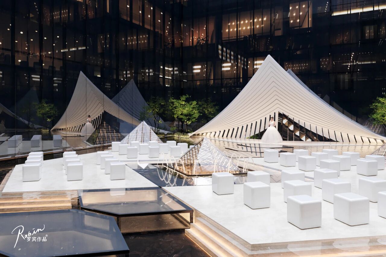 在规模足够大的情况下,自营婚纱馆不仅具有经济效益,在本案中,更能辅助公共区域营造整体婚礼氛围,以大结构为核心视觉,既省钱又能形成明显的艺术感。