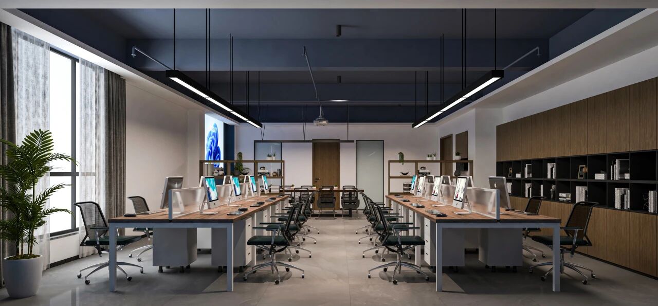 集团总部融入现代新中式调性,简洁干练,以原木色结合藏青色氛围,呼应大堂设计理念。