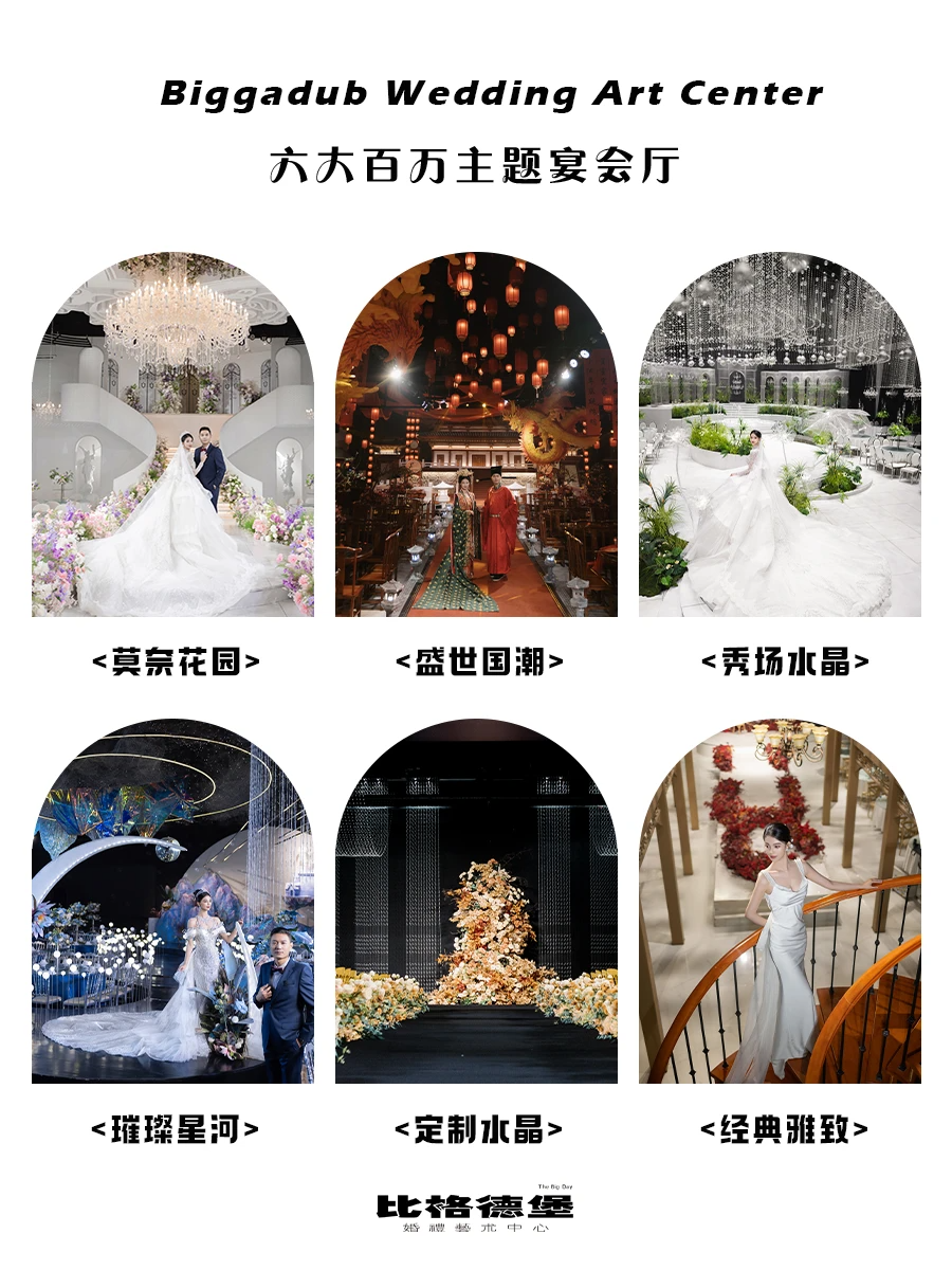 比格德堡婚礼艺术中心,以婚宴、宴会、会议为一体,拥有6大百万主题厅,致力于为新人打造高颜值、高品质的殿堂级婚礼!