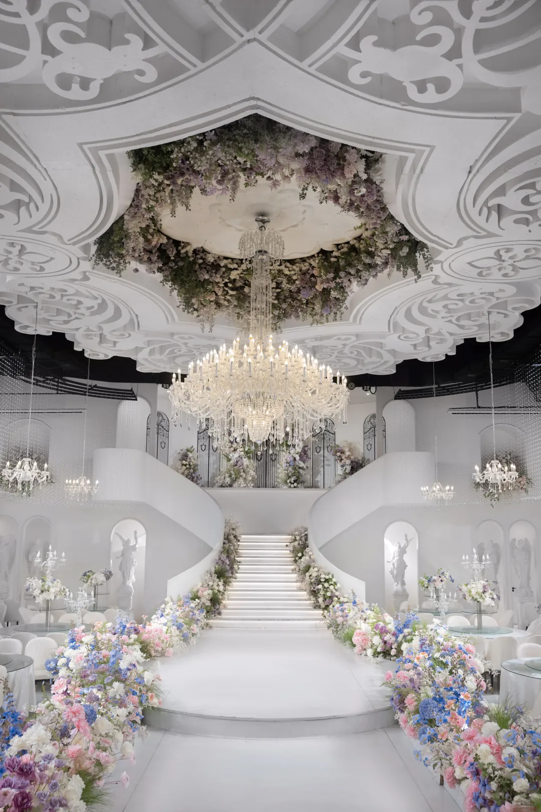 晶莹的水晶灯似将星光捕获,把时间都晕染得温柔缱绻。在满是馥郁鲜花的纯白世界中,精致的铁艺门如同童话的入口,正静静等候着幸福的新人与宾客踏入。