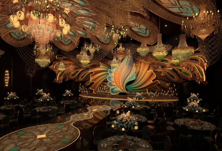 把凤凰羽翼的元素运用到宴会厅顶部造型设计中
