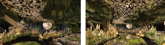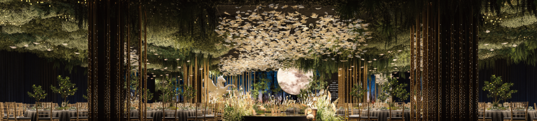 该宴会厅面积约500平,可容纳24桌宾客。在室内造出一片梦幻森林,聆听清晨万物苏醒的声音。在这片光影交错的世界里,每个人都可以成为自己故事的主角,编织着属于自己的月光森林之梦。