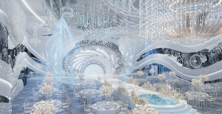 该宴会厅面积近620平,可容纳24桌宾客。以深邃的蓝色为主色调以海洋为灵感展开设计,构建出一座神秘的海底宫殿。