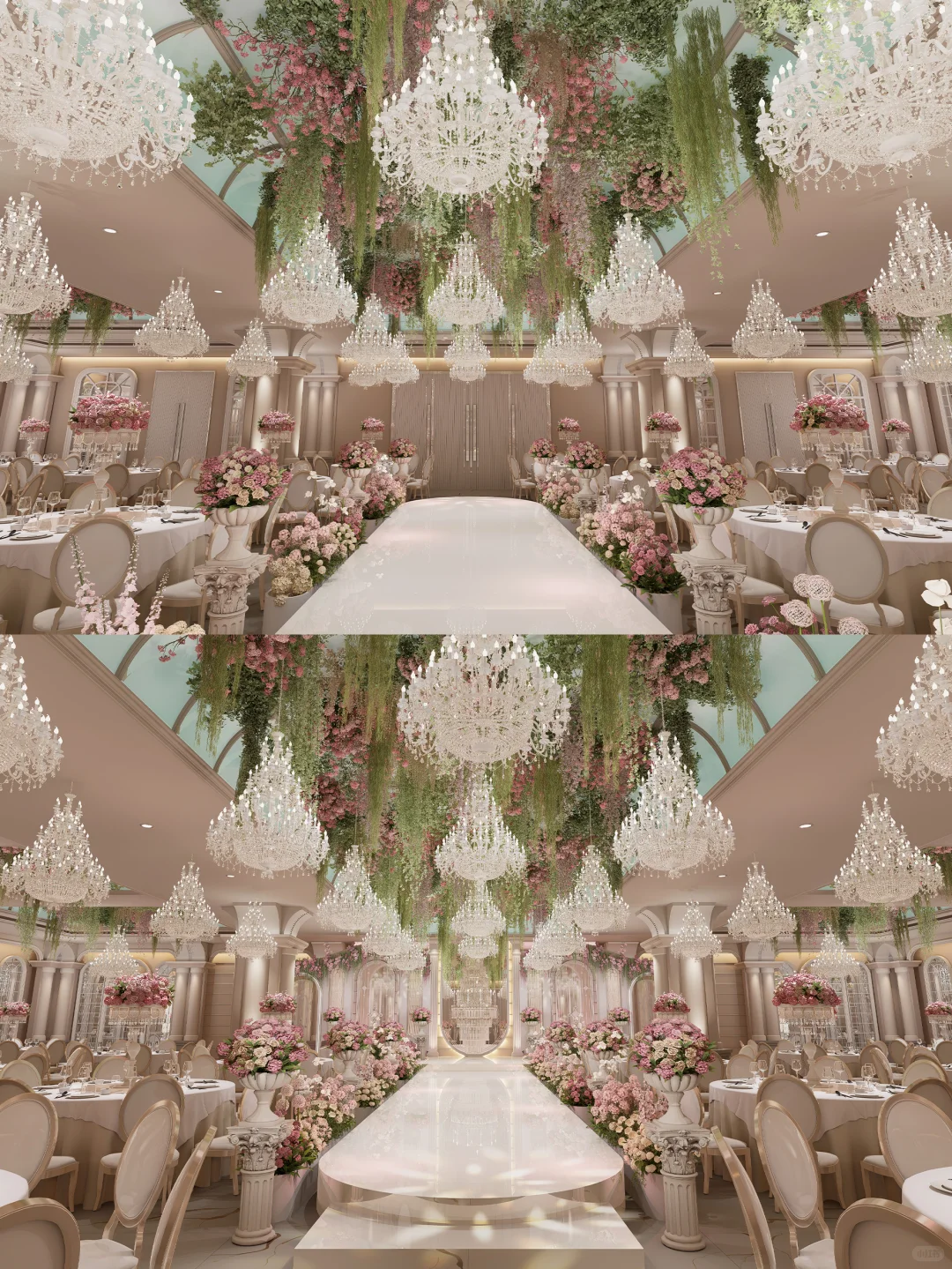 数千颗水晶如星瀑垂落 两侧花径在裙边绽放