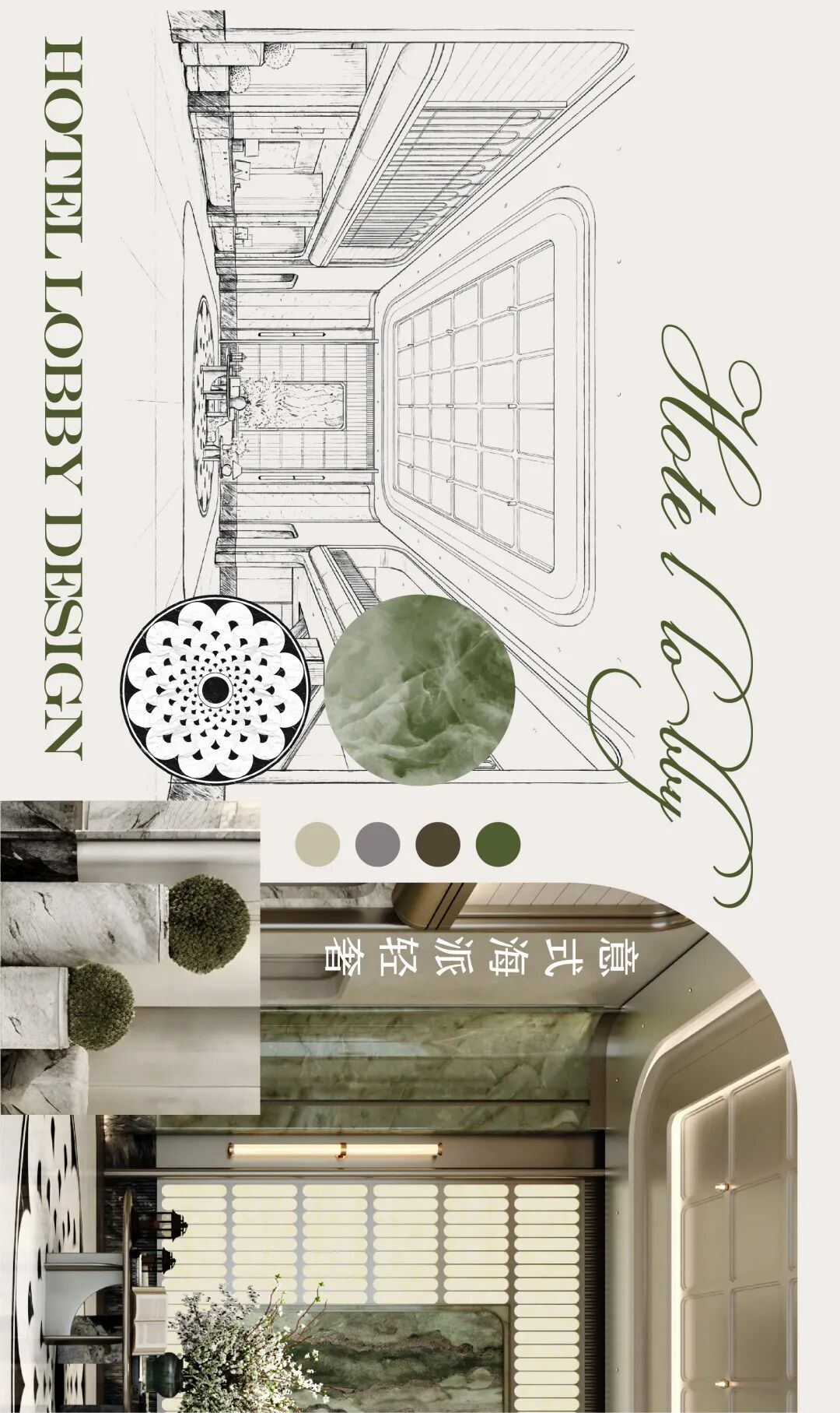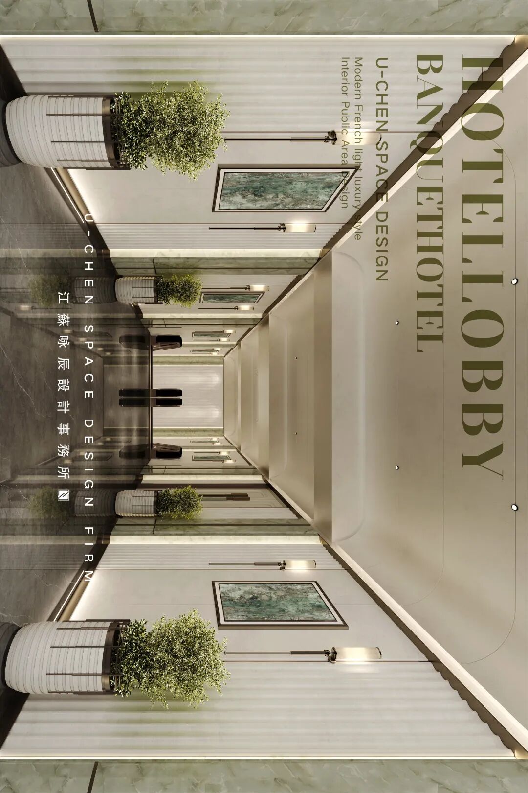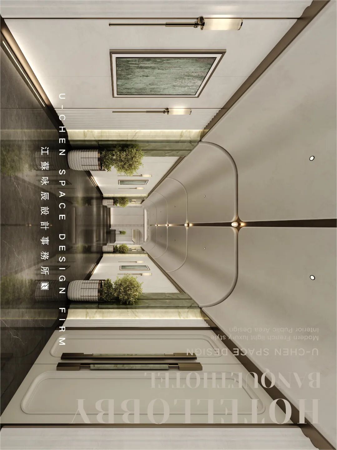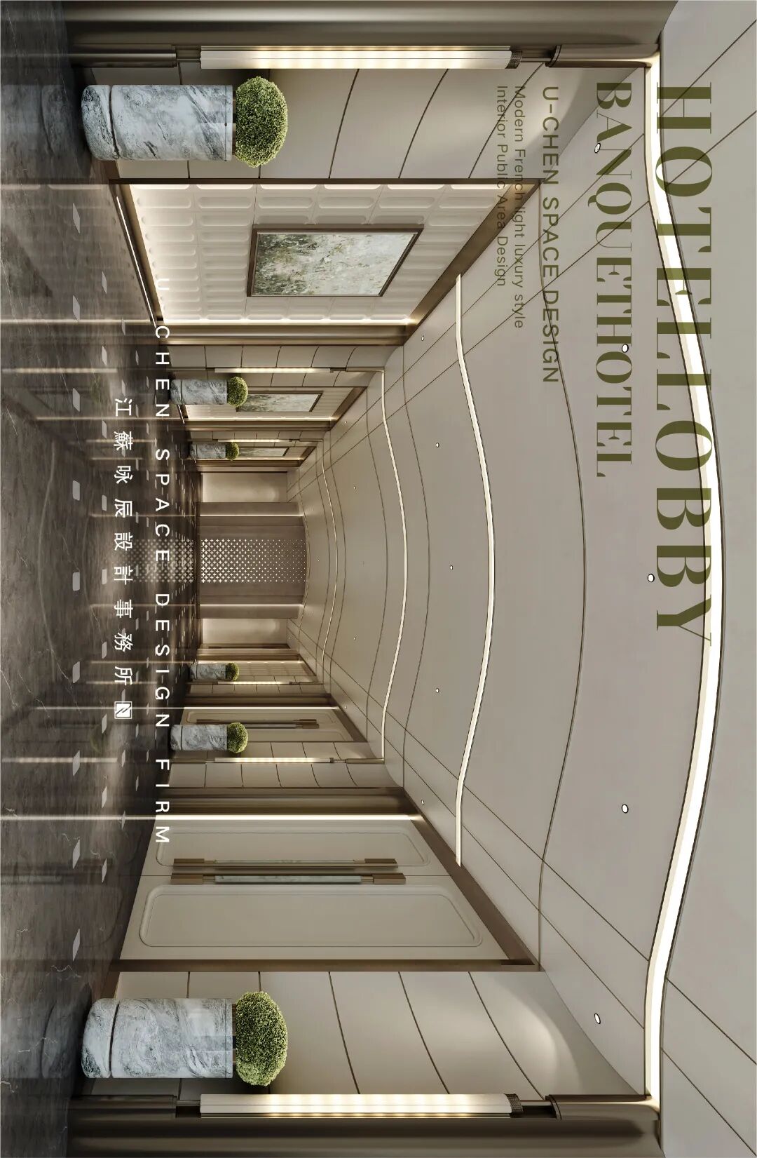 As the elegant beginning of the banquet experience, this prologue hall establishes the overall tone of the space with a modern French light luxury style. The symmetrical and rigorous layout highlights a sense of ceremony, with warm beige toned walls and dark gray flooring creating a soothing and sophisticated contrast. The smooth curved ceiling is embd a humanistic atmosphere, while the open top cabinet doors and hollow partitions ensure functionality while maintaining visual continuity and transparency. The green plants and marble flower bowls embellish the exquisite space, injecting natural vitality and creating a delicate, romantic, and artistic transitional space, quietly embarking on an unforgettable banquet journey.