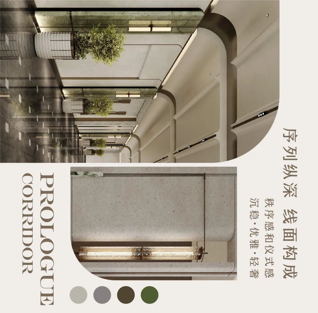 江蘇咏辰設計事務所通过强化空间的纵向线条与透视感,搭配两侧整齐阵列的绿植与线性壁灯,创造出强烈的序列感和仪式感。天花板的简洁线条与均匀布置的筒灯提供了柔和的基础照明,进一步突出了空间的整洁与深度。而一抹绿意则为空间注入了自然生机与柔和气息。整体摒弃一切繁复装饰,依靠比例、光影和点线面构成,营造出一个令人心境平和、专注于空间体验的静谧序厅通道。