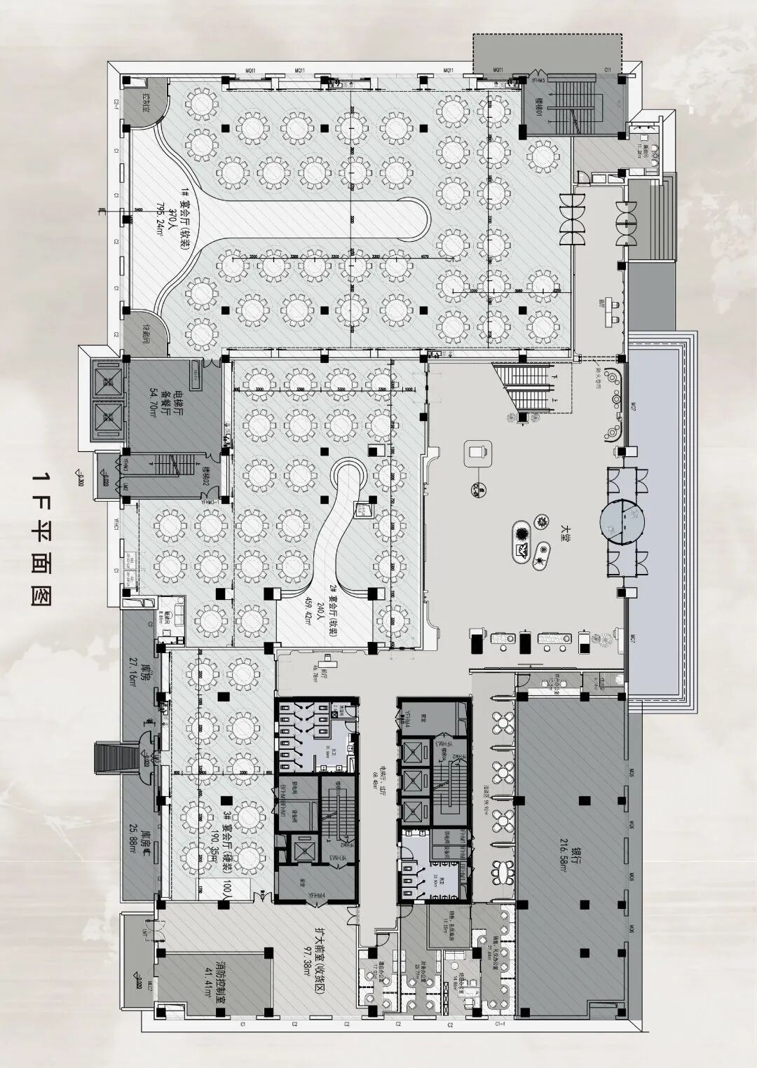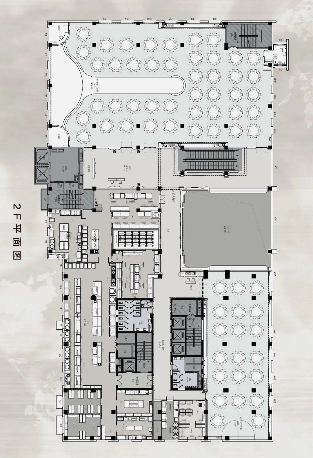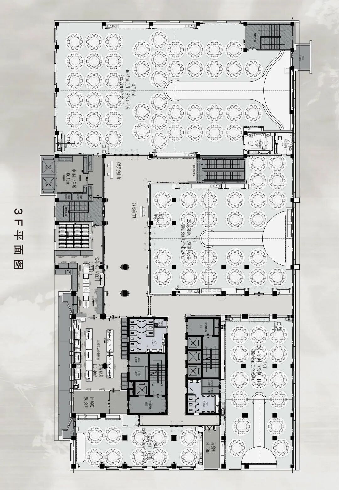 The graphic layout constructed by Jiangsu Yongchen Design Firm for this project revolves closely around the core principle of "experience first, function first". The design, through a scientific flow system and rigorous spatial sequence organization, strongly supports the brand positioning of the high-end wedding art hall of the project. Specifically, the clear vertical active line efficiently guides the flow of people, ensuring a smooth and prestigious journey from the entrance lobby to the core banquet hall; At the same time, the layout cleverly balances the relationship between public areas and private spaces, front guest experience, and logistical support functions, ultimately achieving a perfect balance of multidimensional needs.