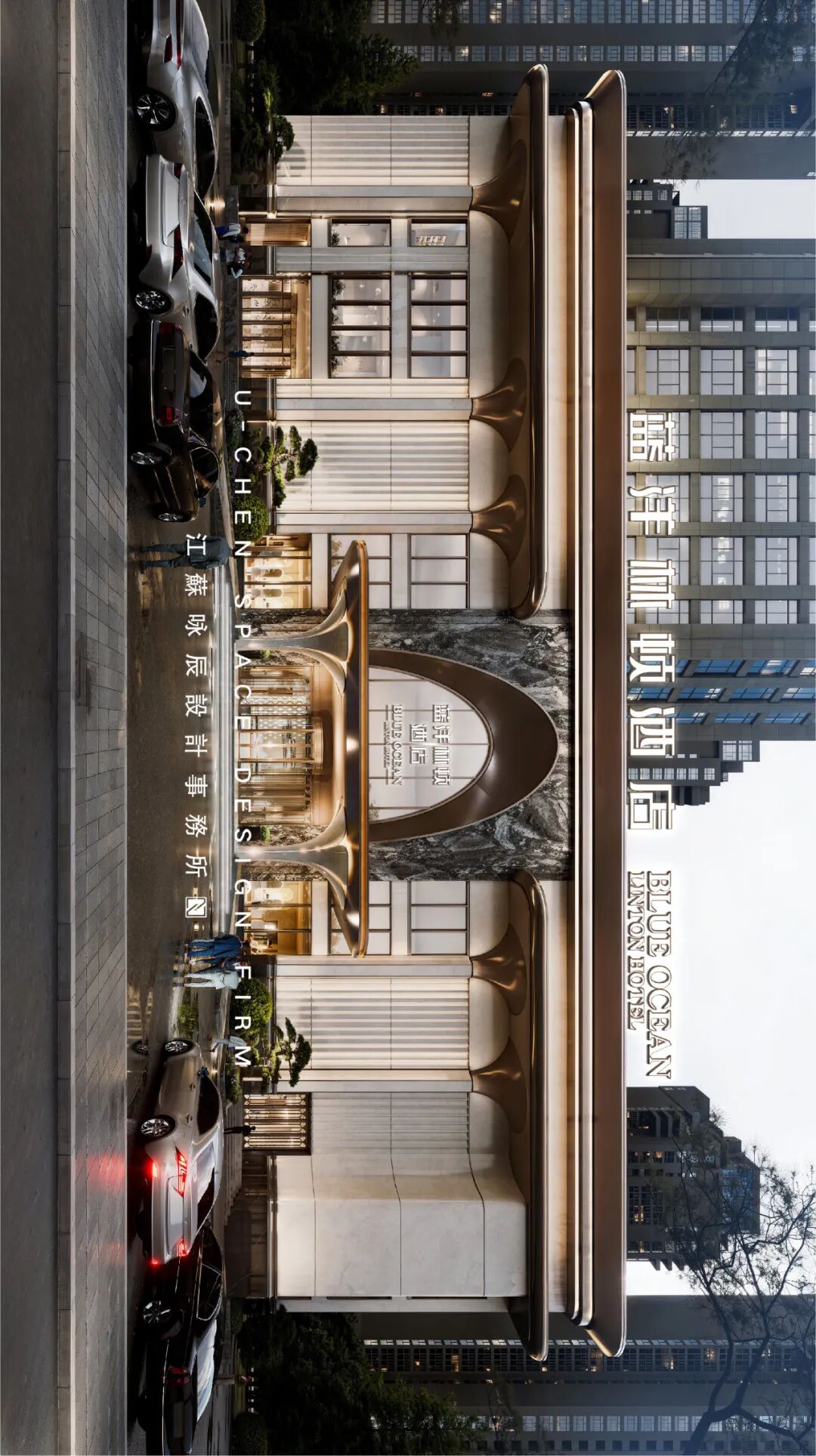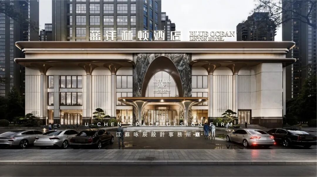 江蘇咏辰設計事務所以现代手法诠释经典仪式感,巧妙融合了建筑的恢宏气势与婚礼的浪漫意境。拱形玻璃门廊以通透轻盈的形态形成视觉中心,既是对古典仪式的致敬,又充满现代张力。米白色石材立面奠定纯净高雅的基调,镶嵌其间的金色竖向线条与深色窗框构成精致对比,于简约中勾勒出轻奢细节。夜间,精心布置的灯光从建筑肌理中透射而出,营造出尊贵且极具辨识度的迎宾形象,使酒店在都市背景中凸显为一座专属于重要时刻的尊贵殿堂。