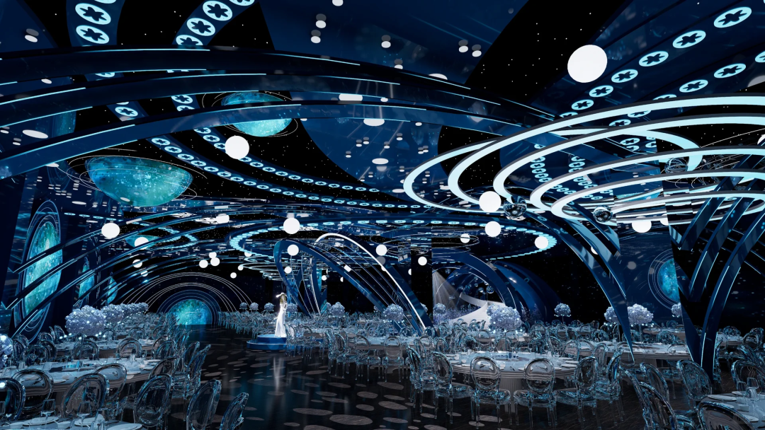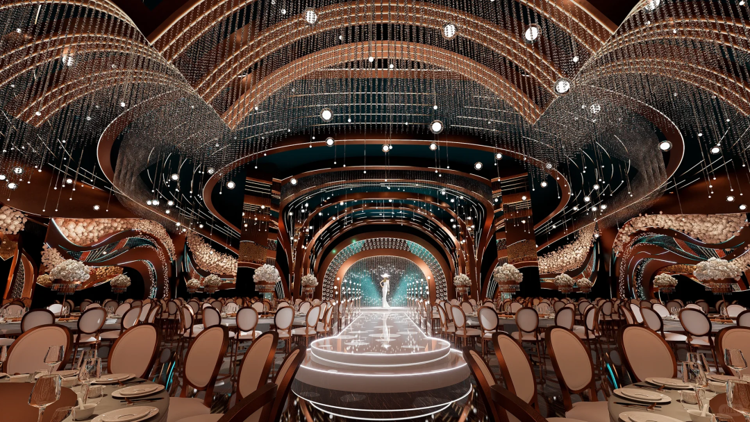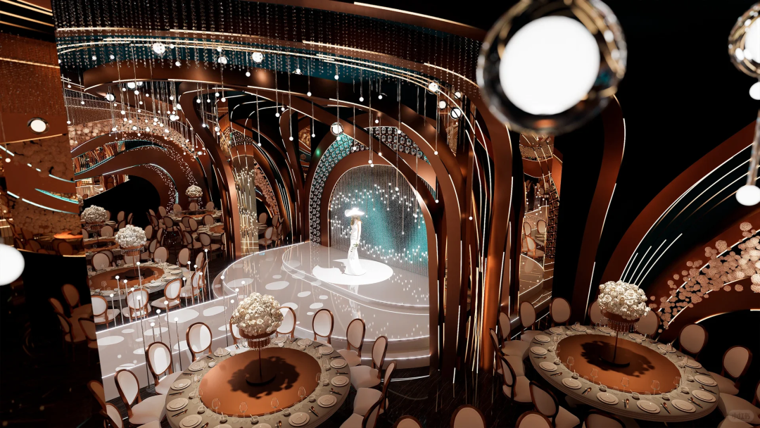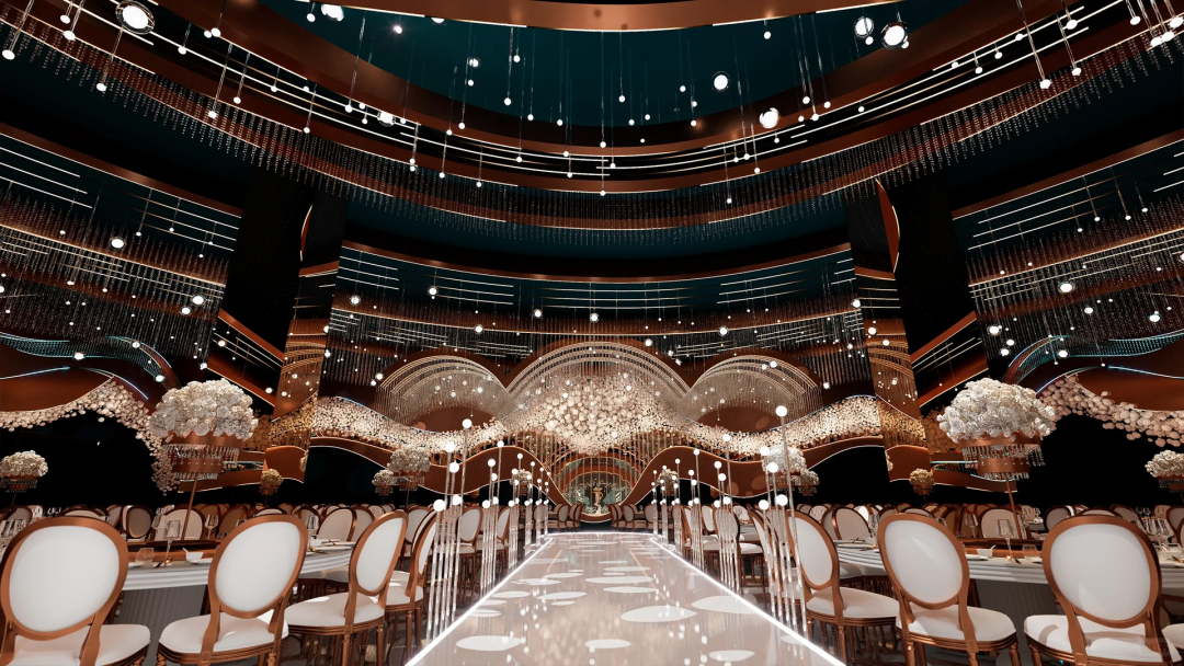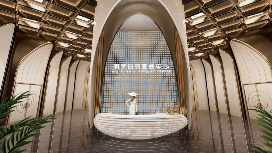 金色大厅在流线型线条和放射性水晶灯的融入下