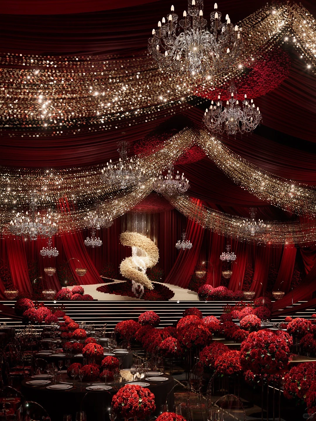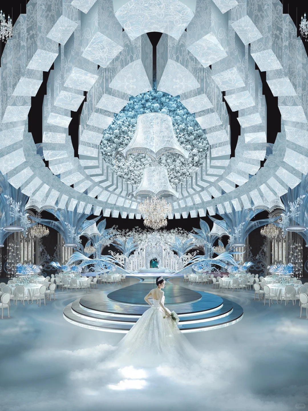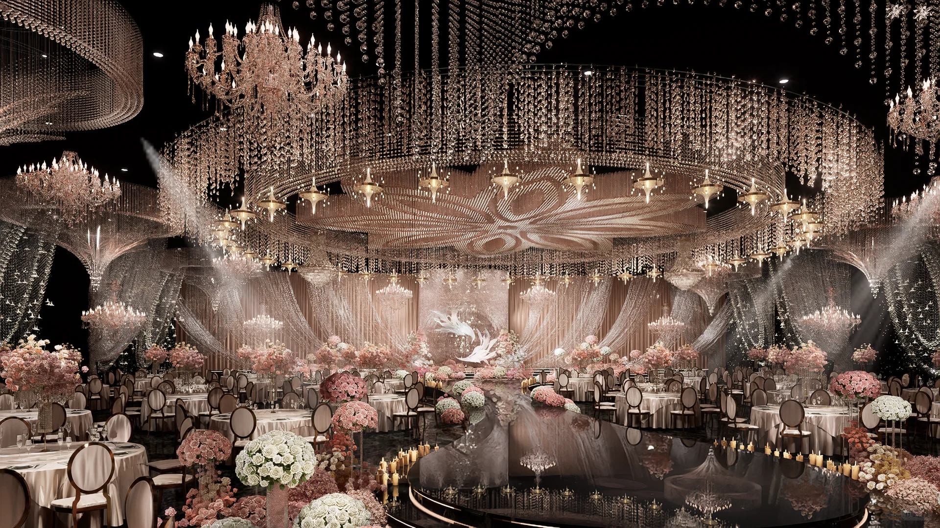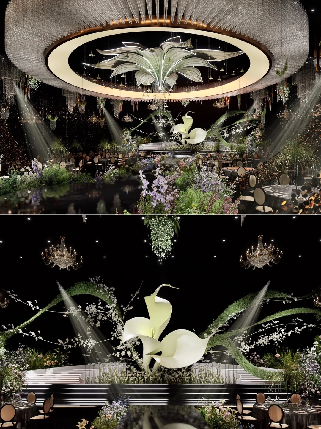 悬浮的水晶吊灯和盘旋的花艺装置