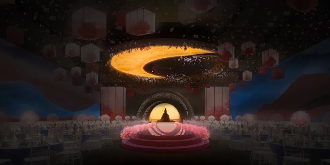 一仑皓月挂悬天空,全场的中式山水如画卷覆满全场