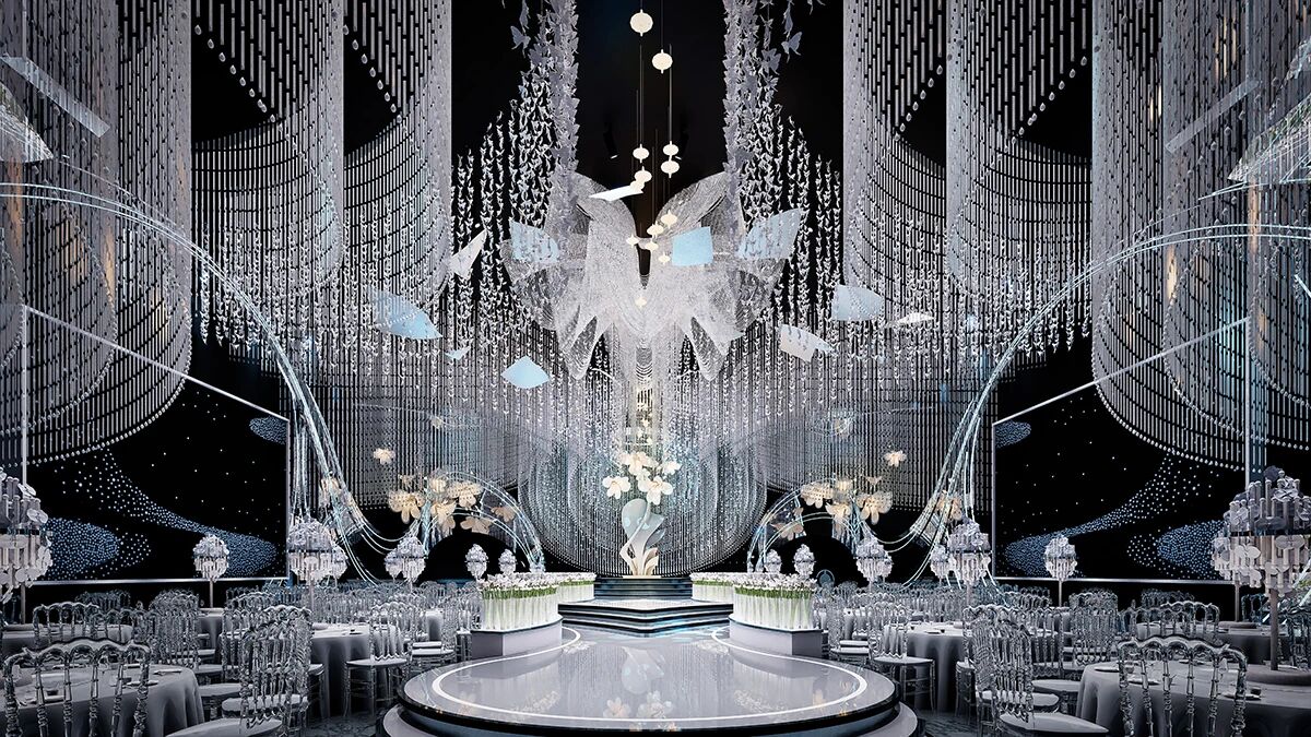 艺术造型的水晶宴会厅则把梦幻感做到极致,首次将AI数字科技融入婚礼场景中让花瓣在空中浪漫飞舞万千水晶垂落,灯光折射时仿佛置身宇宙星空,满足您对梦幻婚礼的所有想象。