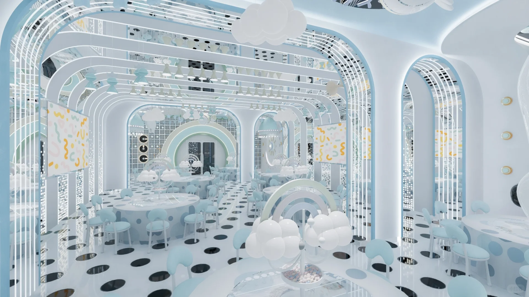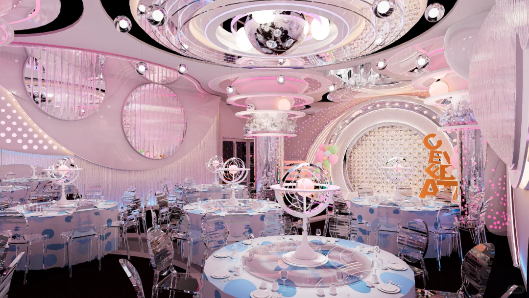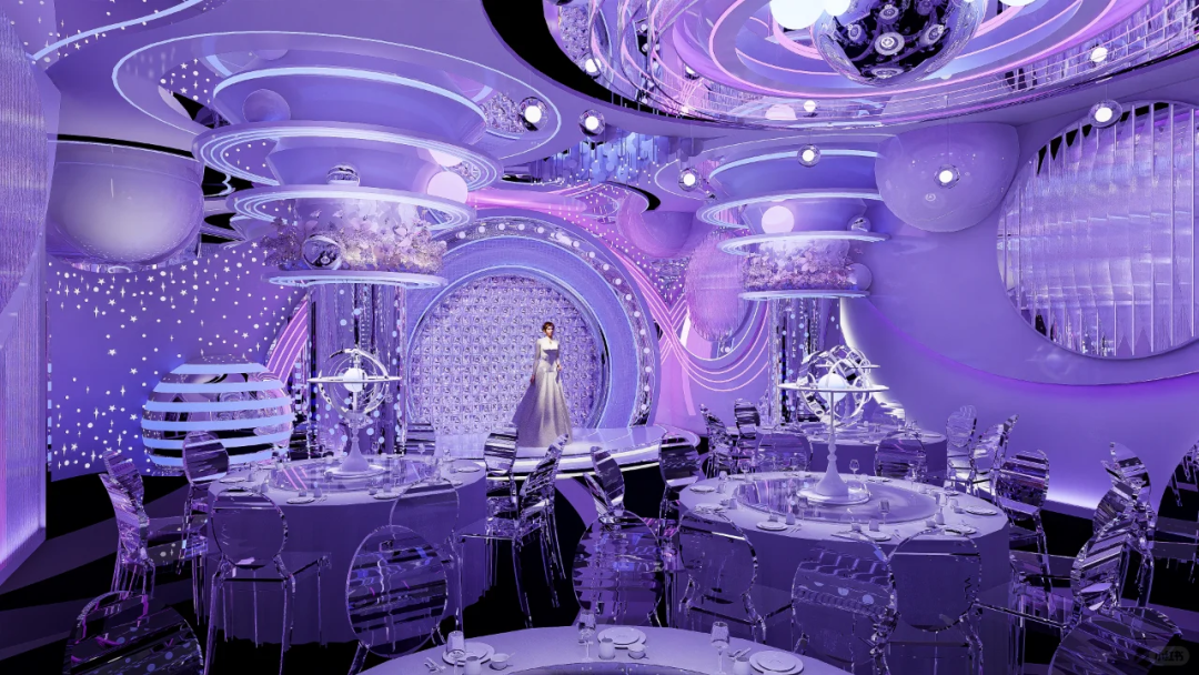 浩渺星河月色总是令人充满无尽的憧憬与梦想,我们以此为依托,打造一座以星河为核心概念的宴会空间,设计将一瞬的动感用规则的弧状曲线呈现,千百年来人类一直在观乎天文,以察时变的不断探索中,激发着对浩瀚宇宙的仰望。