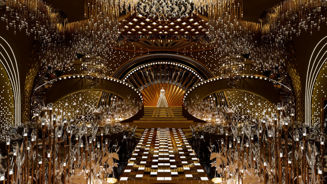 整体构思围绕着奢华辉煌与经典电影美学的交响,将好莱坞的璀璨星光与爱情故事的细腻情感巧妙融合,为新人们献上一场星光熠熠、具有尊贵气质的婚宴。