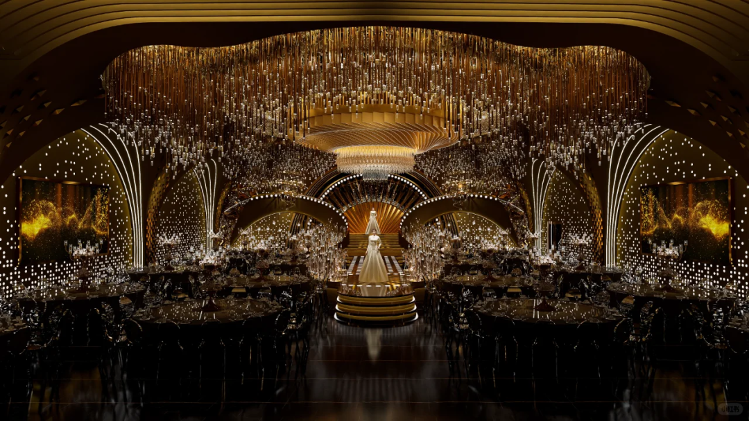当你踏入厅内,成千上万颗悬挂的水晶珠串构成了如梦如幻的“星河”。在璀璨灯光的照耀下,水晶珠串折射出万千光芒,如同夜空中最亮的星辰,引领着每一位宾客缓缓进入一个充满梦幻色彩的世界。