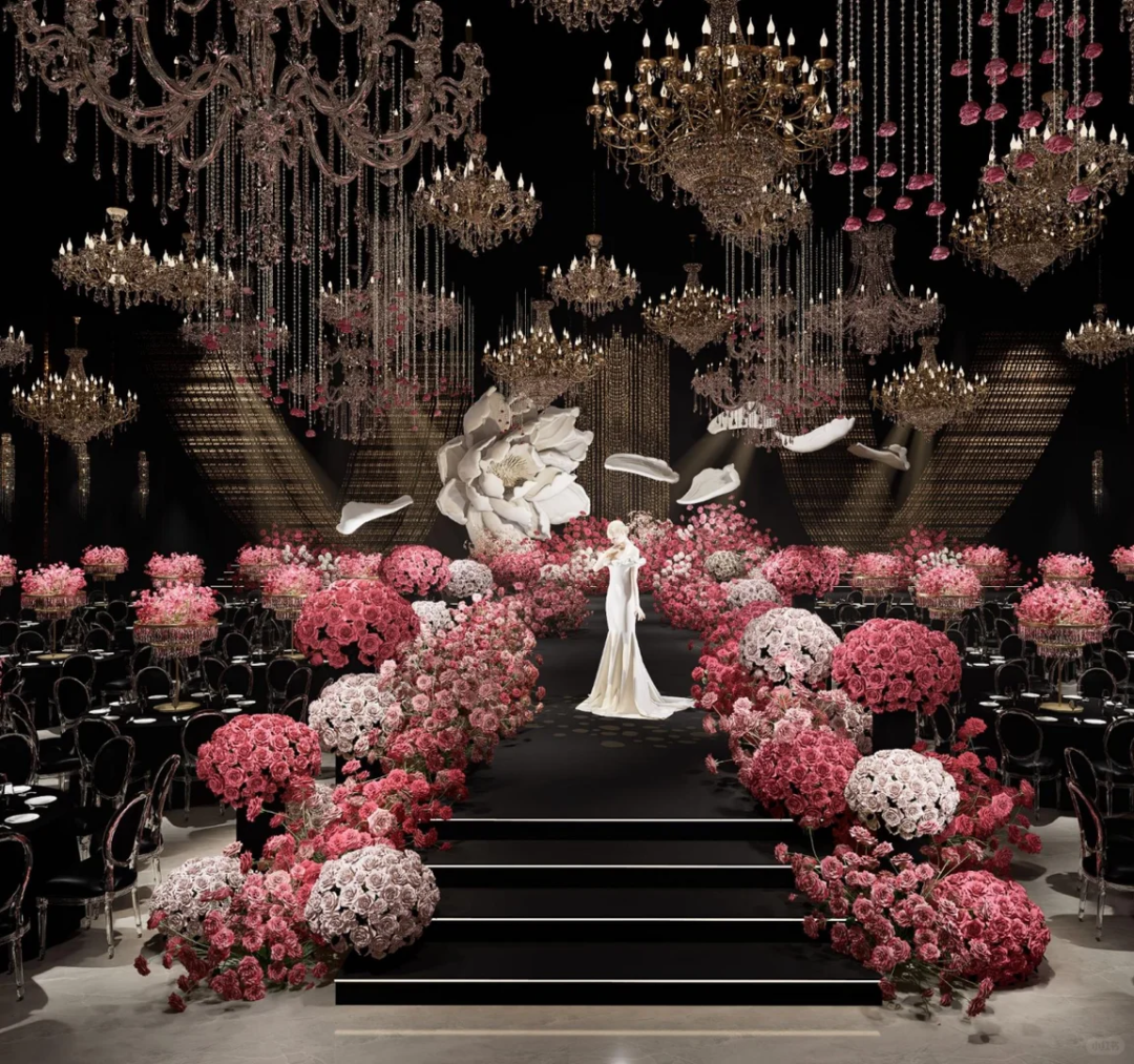 玫瑰色花艺铺成的仪式通道